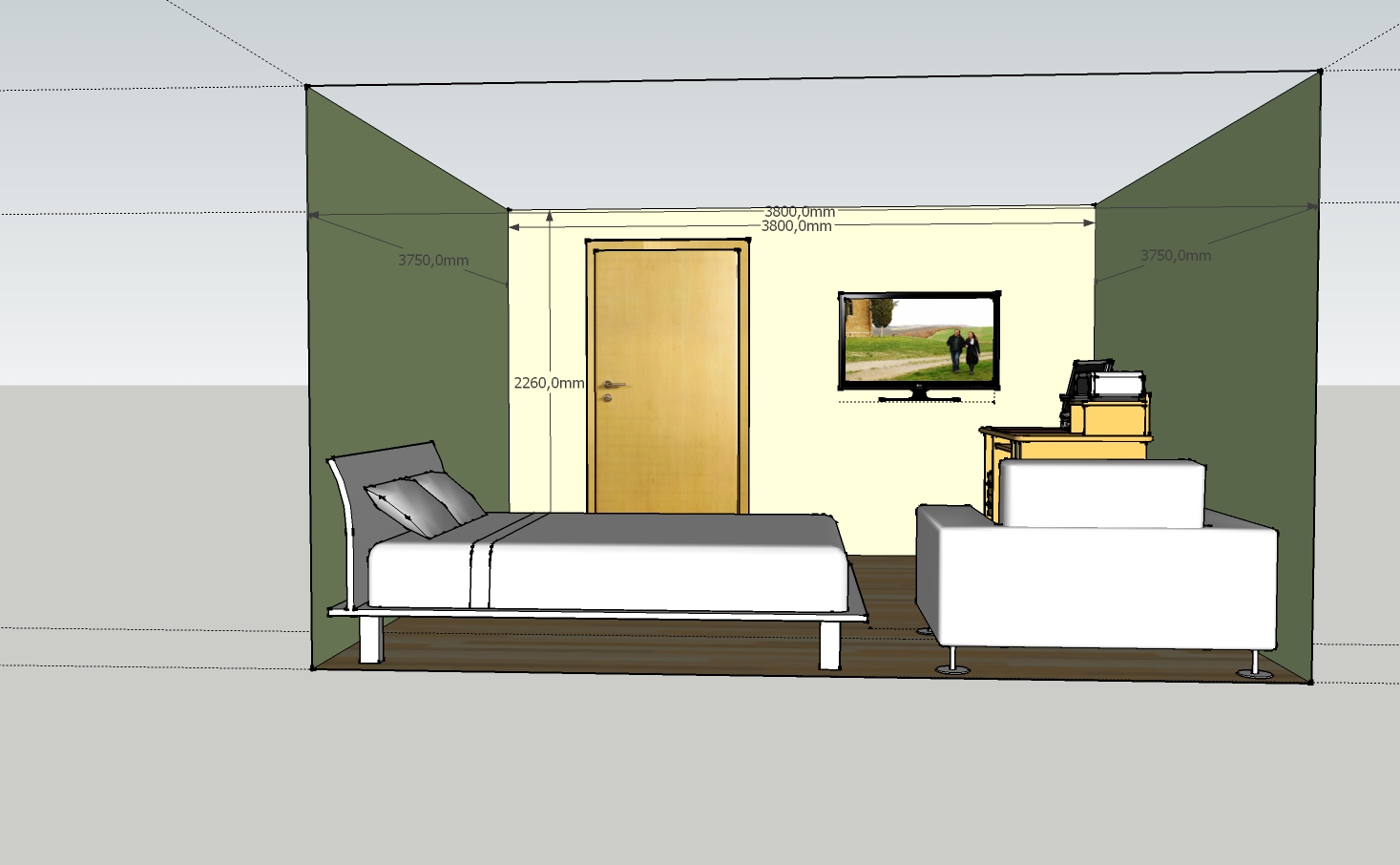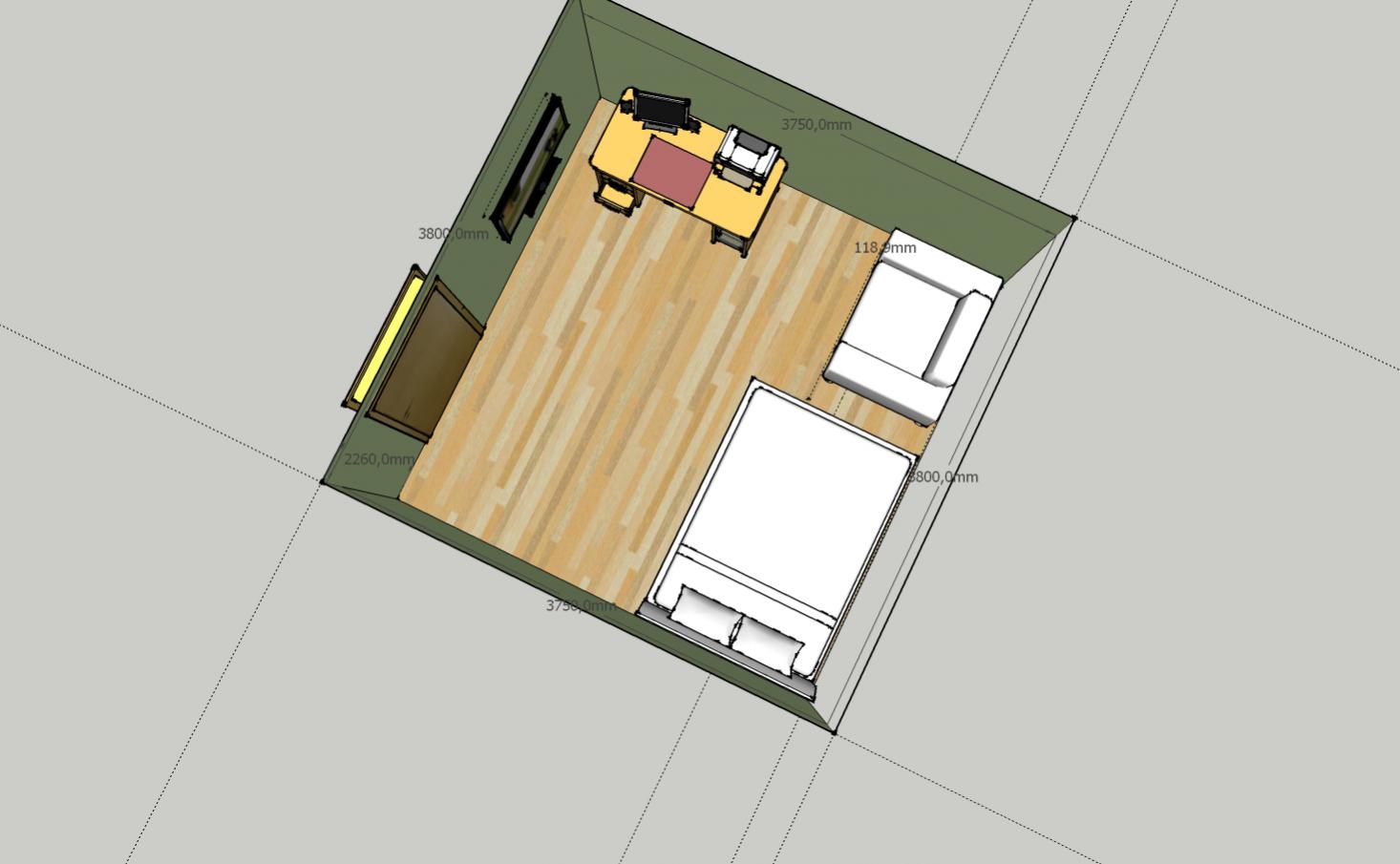 Ich habe mal ne skizze von meinem Zimmer gemacht mit Abmessung etc. die größe von Bett, Couch und Schreibtisch passt nicht zu 100% aber so in etwa kommt das schon hin, zumindest bekommt man eine ungefähre vorstellung davon wie es aussieht und wie die Abmessungen sind.