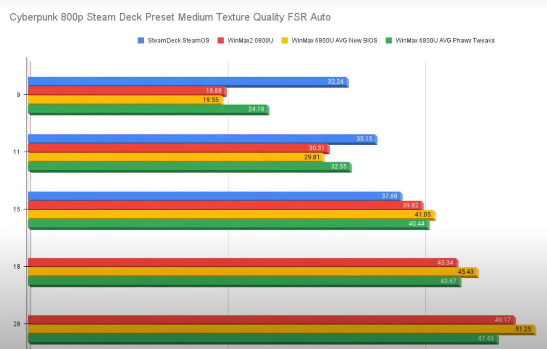 Oder Cyberpunk mit TDP 9 Watt und 30fps/60Hz zocken... denn 60 fps bekommen auch die (bisherigen) High-End-PC-Handhelds mit diesen Einstellungen nicht hin: