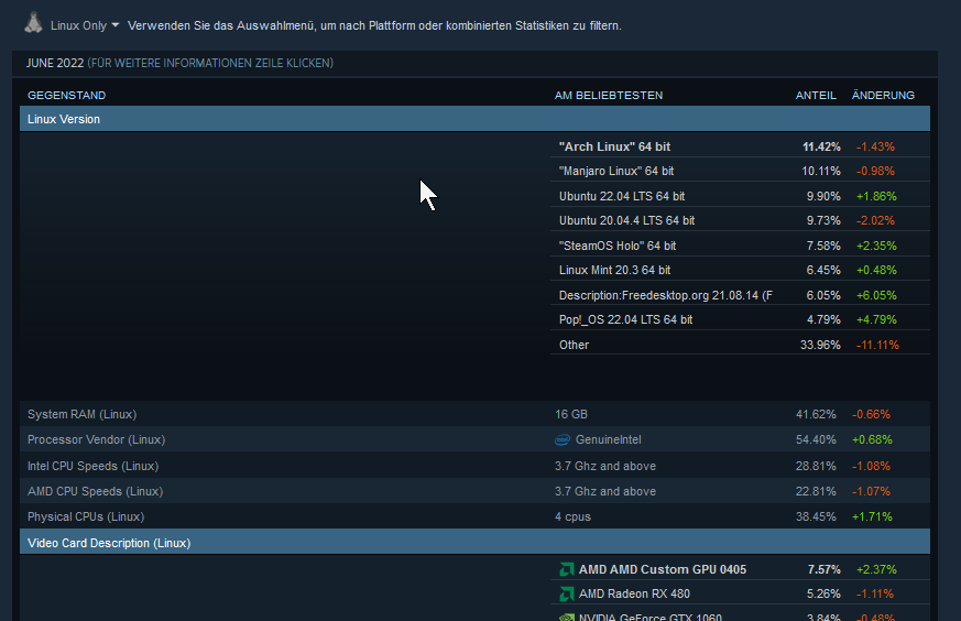 Derzeitiges Problem ist, dass Einladungen zum Hardware Survey nur im Desktop-Modus empfangen werden können. Da die meisten sich überwiegend im normalen Modus des Steam Decks befinden, sind die Statistik-Zahlen noch nicht sehr aussagekräftig.frazzlerunning schrieb:Das Juni Steam Hardware Survey gibt an, das von den Linux Nutzern schon etwa 7,5% auf das SteamDeck entfallen: "SteamOS Holo" 64 bit und AMD AMD Custom GPU 0405 sind die Kennungen die das ziemlich eindeutig eingrenzen.