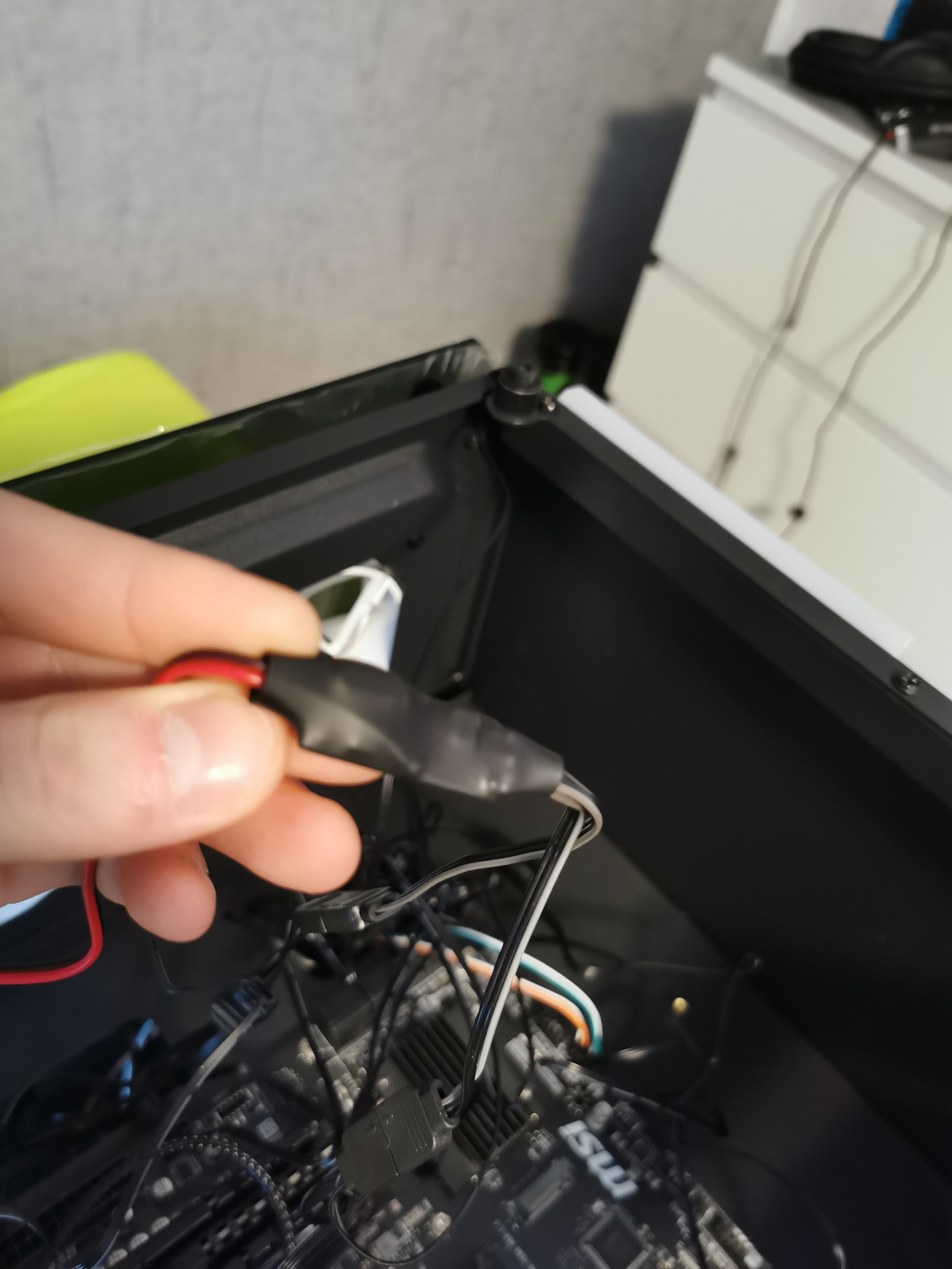 Gestern kam der Cube an und ich wollte anfangen daran zu arbeiten, bis mir ein Problem aufgefallen ist. Zum einen habe ich nur 3 sys_fan Anschlüsse an meinem b550m pro vdh-wifi, weshalb ich wahrscheinlich einen Splitter brauche. Aber das viel schwerwiegender Problem ist, dass die RGB 3 pins von den Lüftern (Azza Hurricane 2) schon alle zusammengeschaltet waren, das wäre an sich kein Problem da ich ein 5v Jrainbow1 Anschluss habe, aber die Stecker sind am Ende durch einen kleinen Chip verbunden (für die Fernbedienung), welcher mit einen uralten molex Anschluss weiter geht und ich weiß patu nicht wie ich diesen Anschluss angeschlossen bekomme. Ich hab ein non modulares Netzteil also kann solch ein Adapter in erster Linie auch nicht so einfach anschließen.