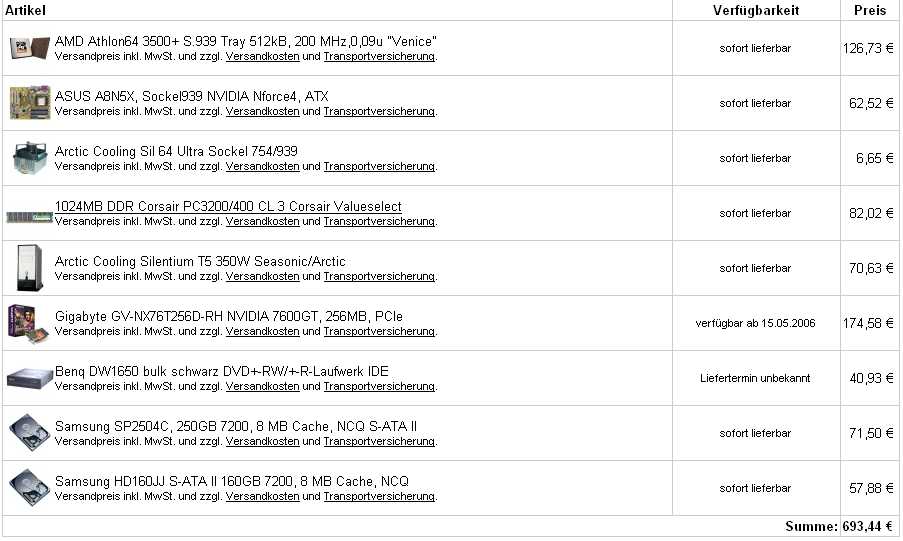 Die Preisangaben beziehen sich auf Amazon.de und falls dort nicht vorhanden auf einen guten Mittelwert von Angeboten bzw. maximal dem Preis, welchen ich damals selbst für die Komponenten bezahlt habe.