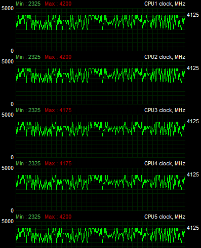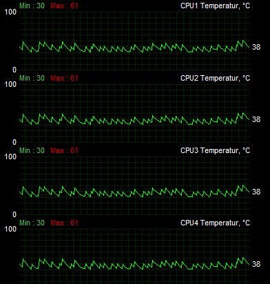 - Im Idle (Office-Betrieb, Internet) springt mein CPU-Takt zwischen 2,3 und 4,2 GHz hin und her. Dabei springen auch die Temperaturen zwischen 30 und 60°C. Ich habe die Temperaturen mal bei Spielen beobachtet, da steigen sie nicht über 70-75°C. Auch bei einem Stresstest mit CPU-Z stieg die Temperatur nicht über 70-75°C.