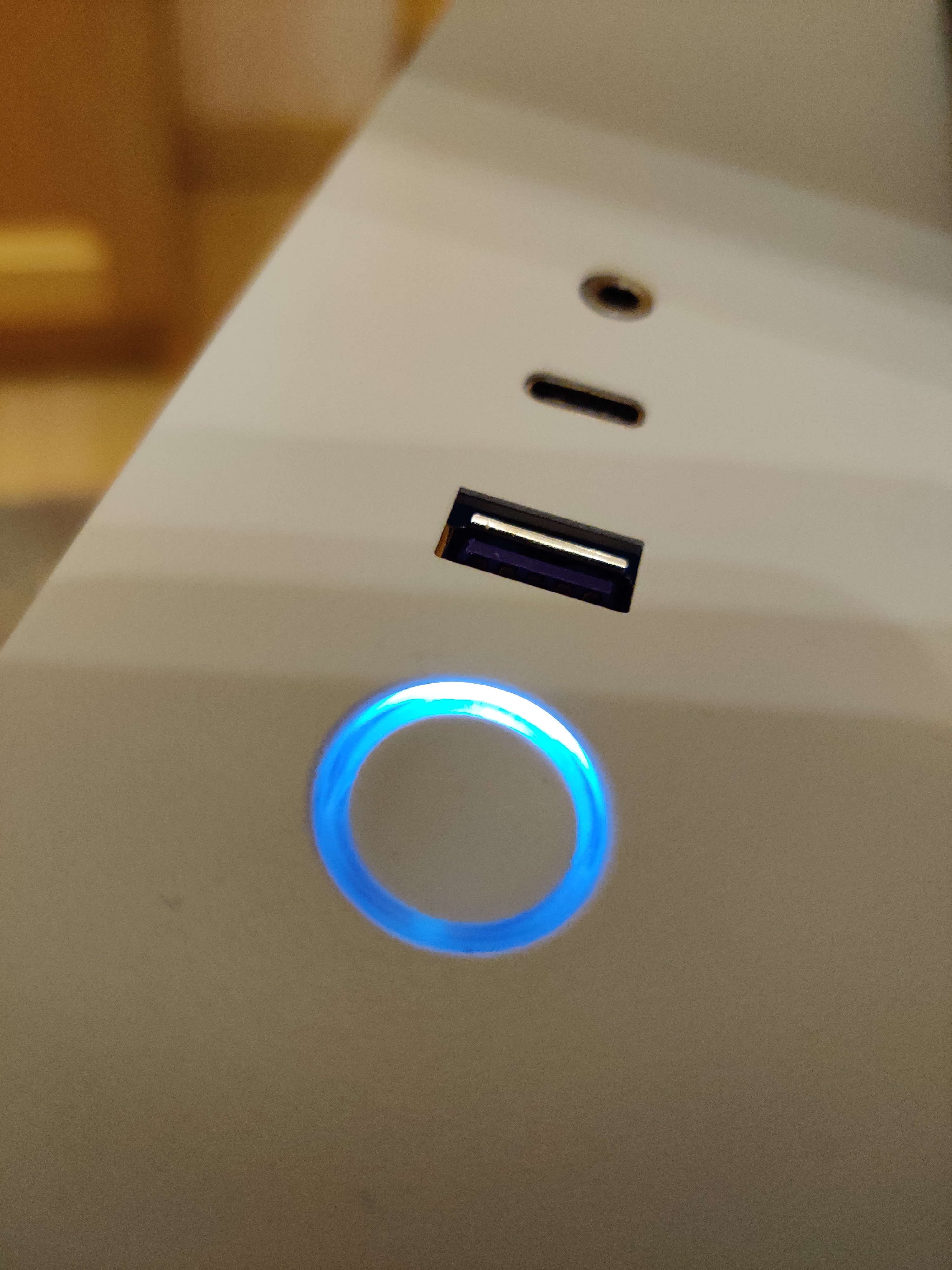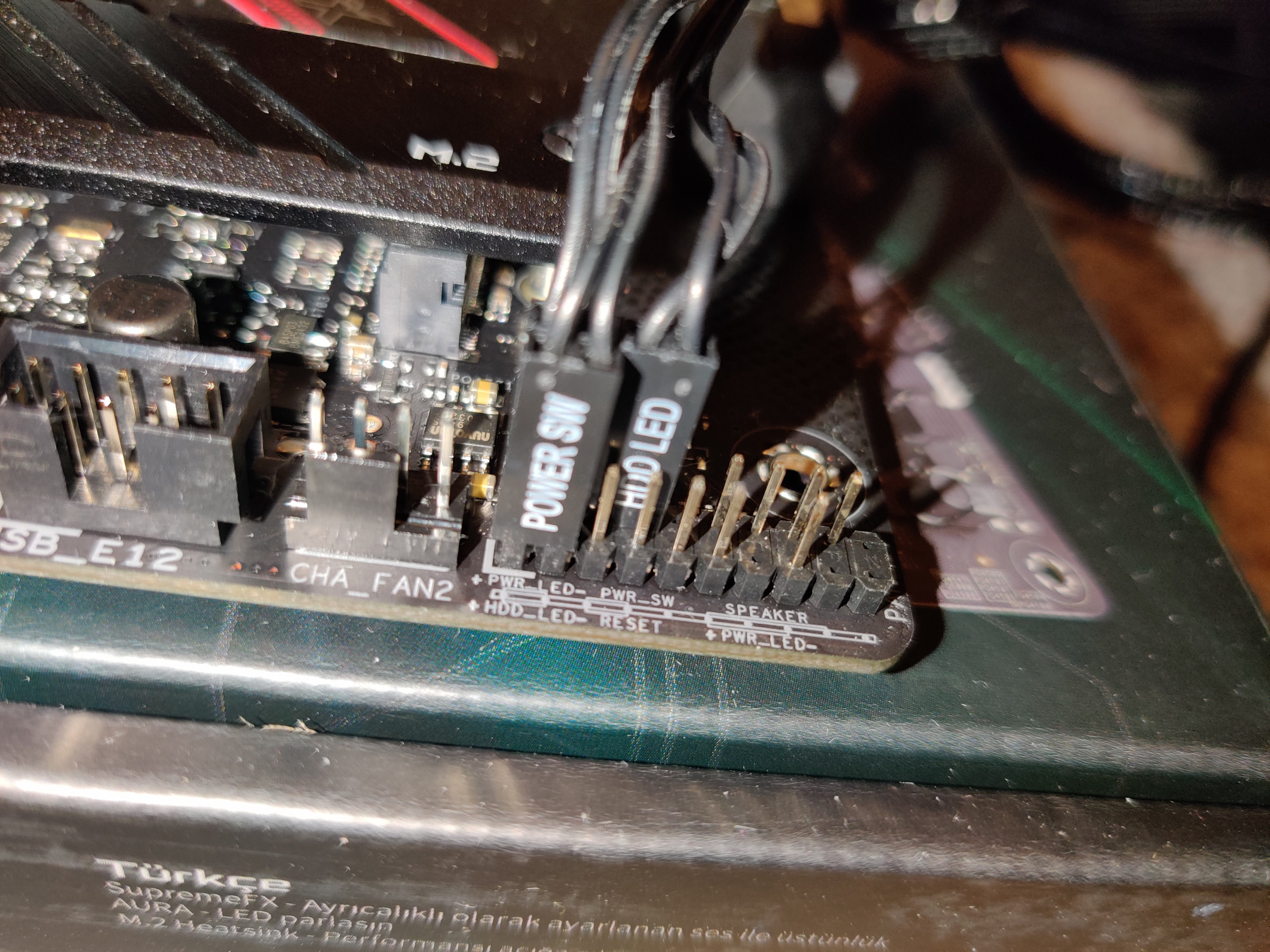 Das Rog Logo leuchtet: also hat das Board Strom. Aber keins der Onboard Problem Led Leuchten. Mein On/Off Knopf vom Gehäuse leuchtet, also auch Strom. Wenn ich den drücke passiert gar nichts.