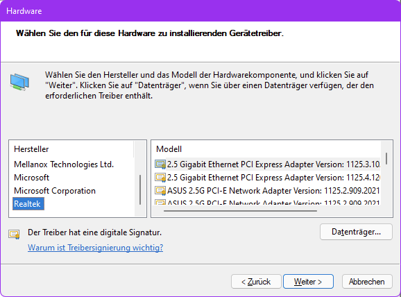 Ich habe in Win10 im Gerätemanager nach dem laut Mainboard Handbuch vorhandenem Realtek RTL8125B LAN Controller gesucht, der wird aber nicht angezeigt.