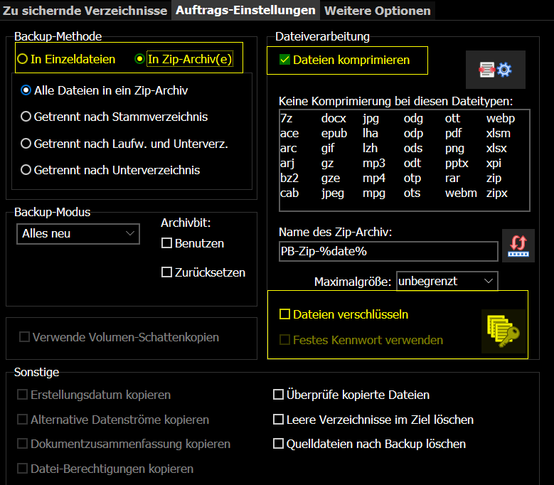 Personal Backup kopiert die zu sichernden Daten unkomprimiert in ein anderes Verzeichnis. Dieses wird dann mit 7zip komprimiert und verschlüsselt. Dieses Archiv schiebe ich dann auf OneDrive. Das ganze läuft manuell als wöchentliches Vollbackup.