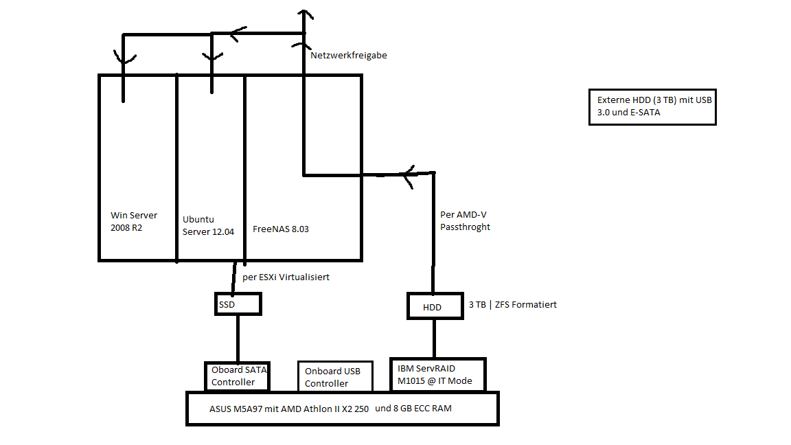 Ziel ist es die HDD (der Kontroller die FreeNAS VM durchgereicht und ZFS Formatiert) auf eine externe HDD (entweder per USB oder E-SATA (E-sata würd auch per Adapter direkt an den IBM gehen) zu sichern.