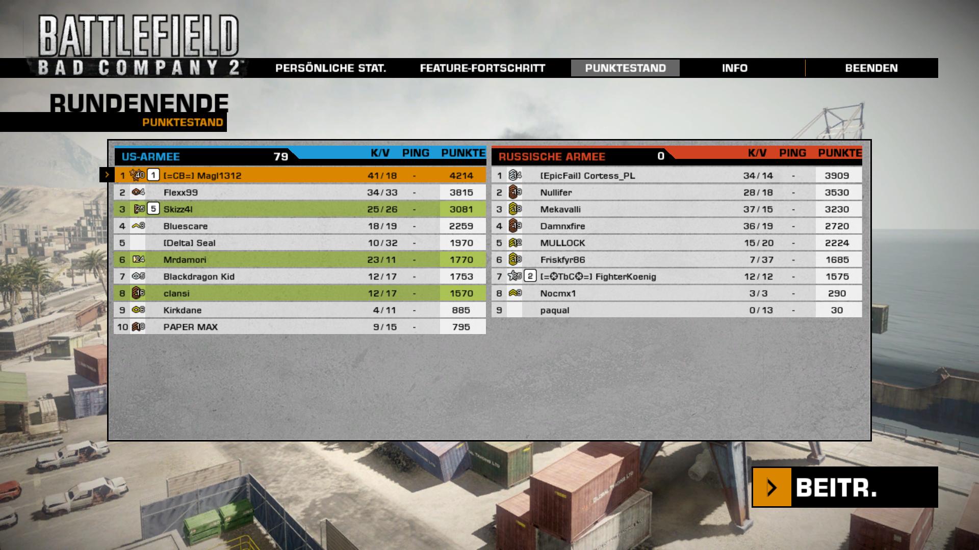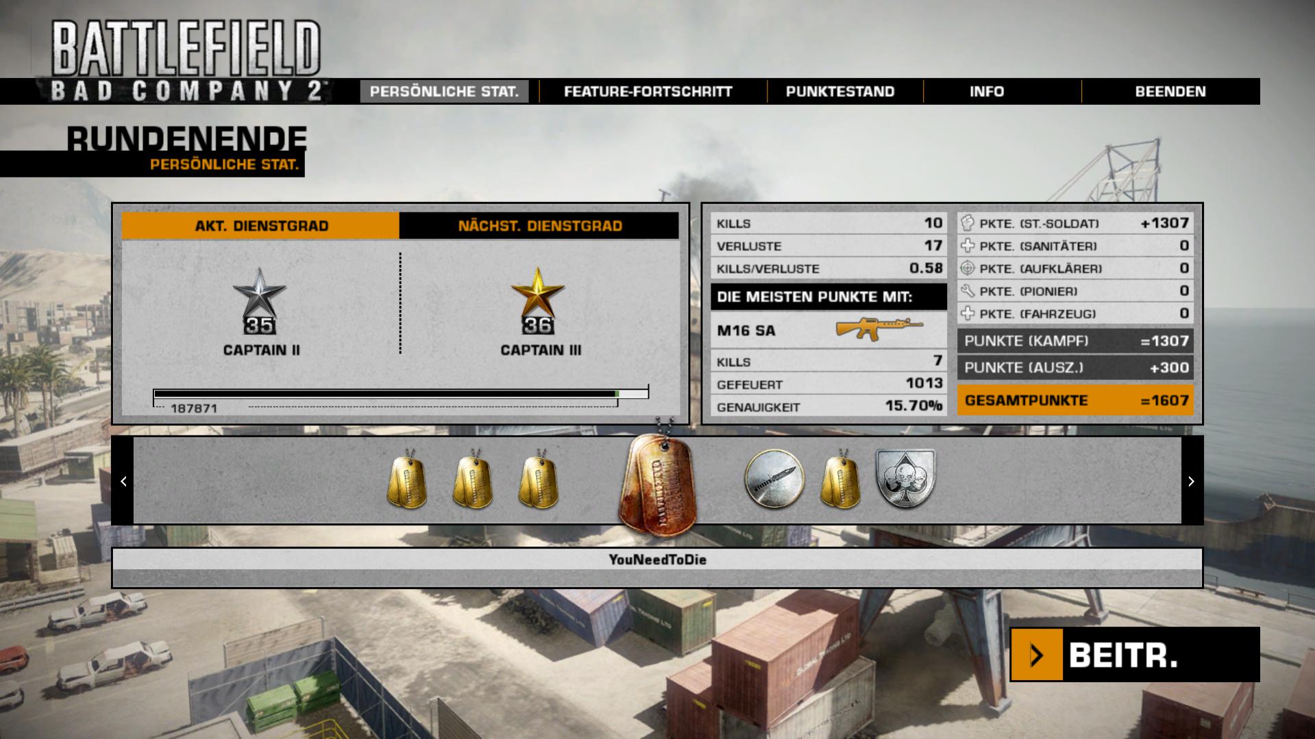 Wenn man aus 5 m Entfernung dem Feind auf den Kopf schießt und er nicht umkippt, kotzt das an. Wenn man ein ganzes Magazin verballert und getroffen hat, der Feind einen erst beim Nachladen bemerkt und man nach einer Kugel stirbt, nervt das. Wenn man sich immer wieder taktische Vorteile erarbeitet, den Feind überrascht, ihn mit Tonnen von Blei vollpumpt, man aber trotzdem draufgeht, nervt das. Wenn man sich so dermaßen aufregen muss, dass der Herzinfarkt kurz bevorsteht, sollte man das Spiel wechseln. Ich kann mir nicht vorstellen, dass ich so schlecht sein soll, was ich immer wieder erlebe. In einer Runde habe ich mir 5 Dogtags geschnappt. Insgesamt dürften es an die 10 gewesen sein. Und auch deshalb nur so wenig, weil mehrfach der Messerbug aufgetreten ist bzw. dieses Phänomen, was ich auch bei Domi hatte.