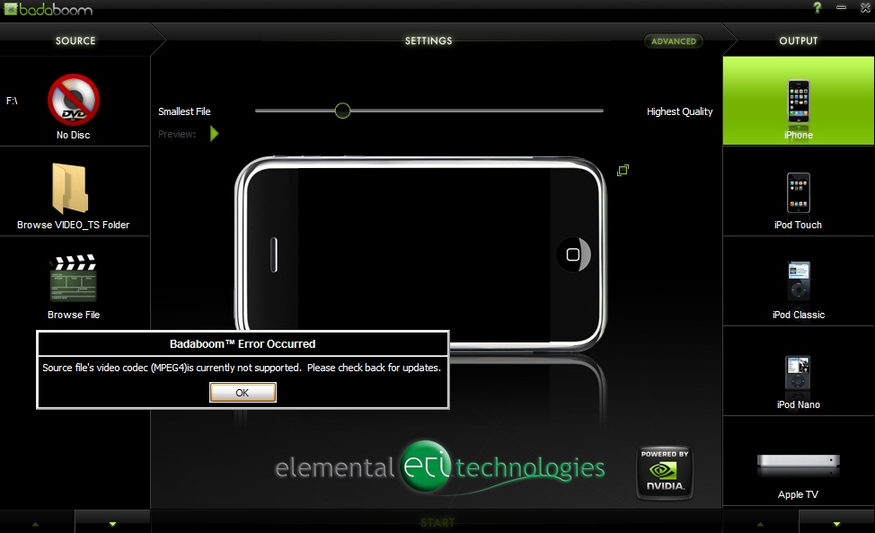 Der erste Durchlauf dauerte ~17min (41frames) und ergab ne grottige Bildquali sowie schlechten Ton. Bei der Bildquali hats mich nicht überrascht (is für die Auflösung zuwenig), nur hat Badaboom den Ton einfach in 64kbits (AAC) runtergedreht. Endprodukt hatte 132MB.