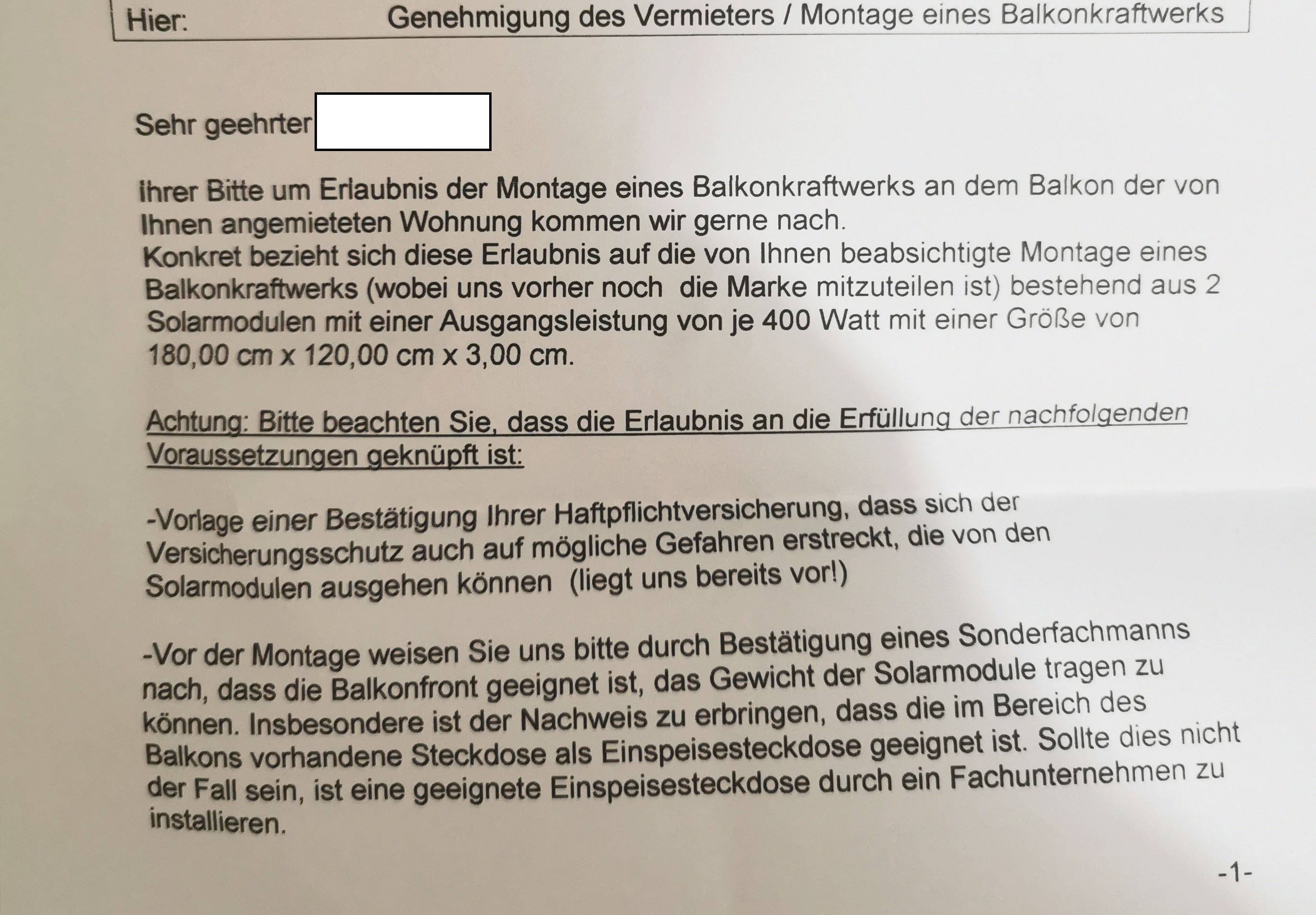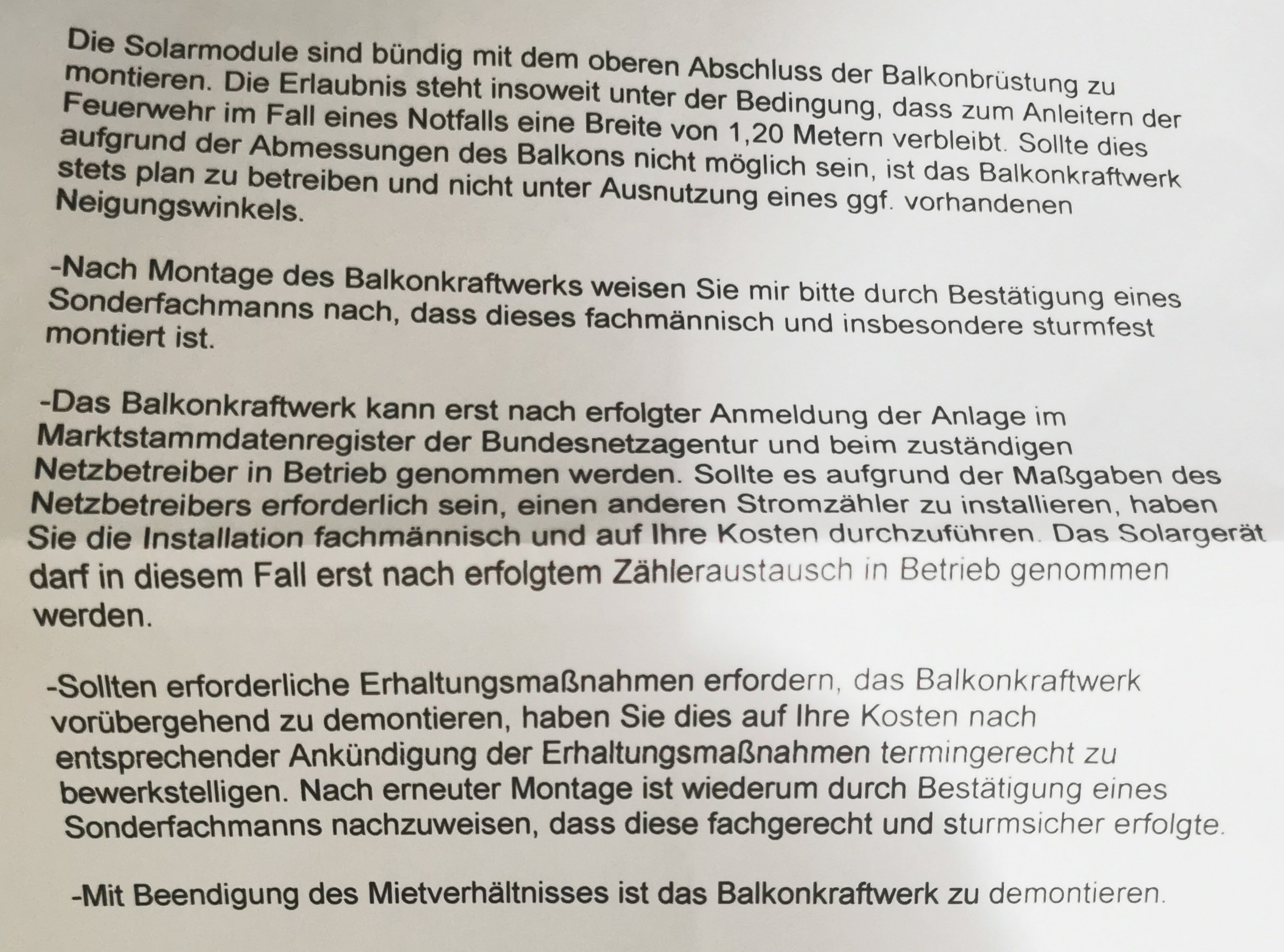 ich möchte mir ein Balkonkraftwerk auf dem Balkon meiner Mietwohnung installieren. Im letzten Jahr hat die Vermieterin es noch abgelehnt (Grund: bauliche Veränderung, Optik). Dieses mal bin ich schon weiter gekommen. Jedoch stellt Sie diverse Anfoderungen, die, wenn ich diese erfüllen würde, das Unterfangen unwirtschaftlich machen. Im Anhang ist der Brief.