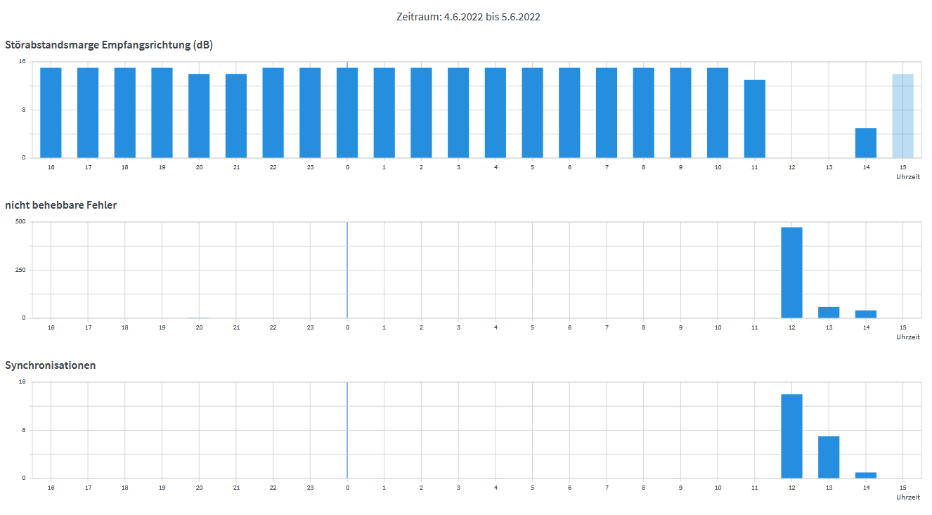 Das geht jetzt anscheinend so weiter, wie vorletzte Woche: 5 Min Sync dann De-Sync. Fehlerwerte kommen dann solche, wie im folgenden Bild. Wie kann das eigtl sein, dass die Störabstandsmarge plötzlich soviel schlechter wird?