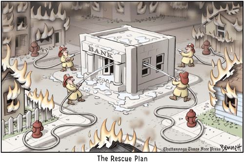 Und wie sähen die Alternativen aus? Die Bank pleite? Wenn man bedenkt, was hinter einer Bank alles dran hängt, dann reicht eine einfache Nutzen-Kosten-Analyse aus um zu sehen, das ein Kredit oder die Bürgschaft für einen Kredit volkswirtschaftlich billiger ist, als eine Pleite. Klar, kleine Banken könnte man aufgeben, aber die Banken, von denen aktuell die Rede ist, sind Giganten. Gehen die den Bach runter, reißen sie andere Banken und Unternehmen mit in den Abgrund. Und das war ja 1929 das Problem: die Banken wurden nicht gerettet und andere Unternehmen, die daran hingen, wurden mit in die Tiefe gezogen. Es gab kaum mehr freies Geld, Kredite waren teuer, es gab keine Investitionen mehr. Das wird versucht dieses Mal zu verhindern.