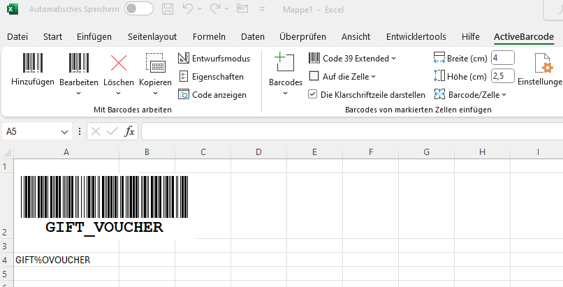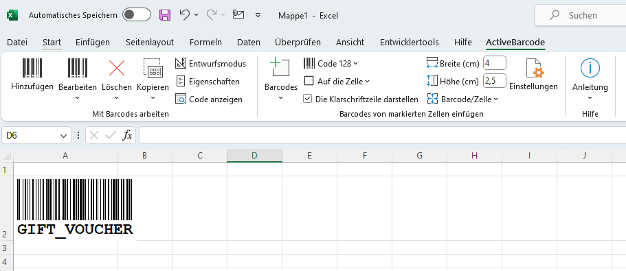 Das ganze würde ich gerne in Excel machen, eine ActiveBarcode Lizenz ist vorhanden.