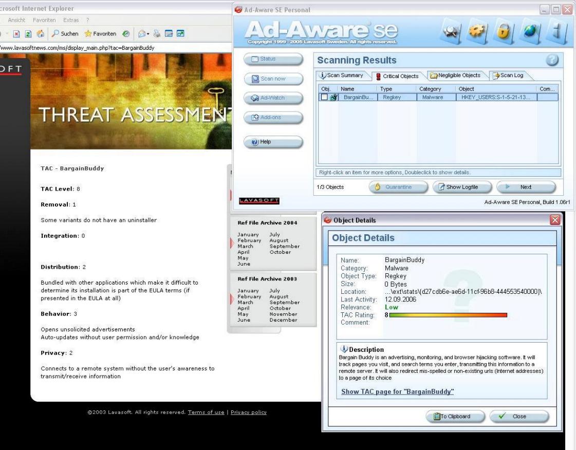 ich hab mir irgendwie die BargianBuddy Malware eingefangen welches mir von Ad-Aware Se angezeigt wird. Es kann damit auch entdernt werden allerdings nur für kurze Zeit. Es kommt ständig wieder. Ich habe auch schon Antivir und schon einige spezielle Removal Tool (z.b. von Symantec) probiert , welche aber auf ganzer Linie versagen und BB nich mal finden.