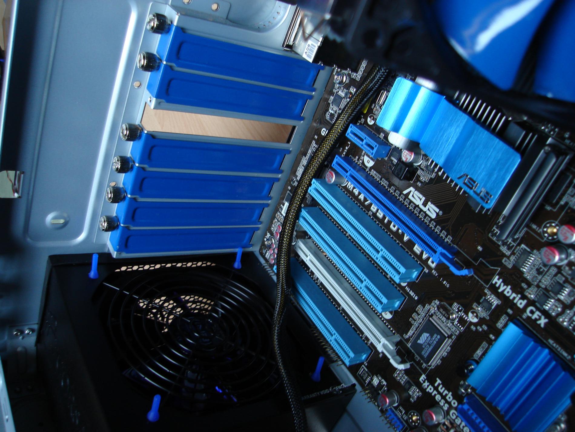So, fertig. Mit dem Casemod und den Nerven. Front leuchtet, Seitenteile Sind entkoppelt, HDD ist unten platziert, so wird es leiser, altes "Lüftergitter" ist rausgeschnitten und durch ein richtiges ersetzt worden, und das Laufwerk ist auch blau. Das mit dem rest lackieren lass ich sein, da es ja doch kein Window gibt. Das selbe gilt für das Sleeven.