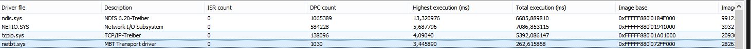 Durch einen Post der sich mit Torrents und DPCs beschäftigt hat sowie ein Malwarebytes Post (ich habe kein Produkt der Firma installiert), bin ich dann auf die Spur gekommen dass die Base Filtering Engine (MD5 Sum der .dll ist in Ordnung, mit Farbar Service Scanner überprüft) zu hohen DPC Latenzen führt, und ndis.sys, netio.sys und tcpip.sys, netbt.sys