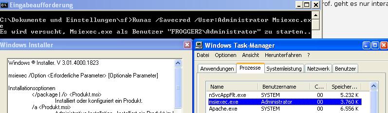 so funktioniert es aus der CMD raus, es funktioniert aber nicht innerhalb einer Batch, weil die Batch erst im Benutzermodus ausführt wird. Dh. Msiexec startet dann nicht mit Administratorrechten(deswegen der Fehler #5). Die Option Safecred hat den Vorteil, dass man das Passwort nur einmal pro Sitzung angeben muss. Safecred wird aber nicht von allen Windows Versionen unterstützt.