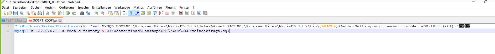 C:\Windows\System32\cmd.exe /k  "set MYSQL_HOME=C:\Program Files\MariaDB 10.7\data\&& set PATH=C:\Program Files\MariaDB 10.7\bin\;%PATH%; && echo Setting environment for MariaDB 10.7 (x64) && mysql -h 127.0.0.1 -u root c-factory < C:\Users\flosc\Desktop\UNI\KOOP\ALS\meineabfrage.sql "