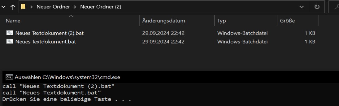 Nach dem Ausführen der "Master-Batch"-Datei mit dem o. g. Code werden mir zwar die im Ordner befindlichen Batch-Dateien im geöffneten Konsolenfenster namentlich genannt (vgl. Anhang), aber sie werden augenscheinlich nicht ausgeführt respektive es erfolgt keine Bildschirmausgabe in der Konsole oder in einem neuen Konsolenfenster.