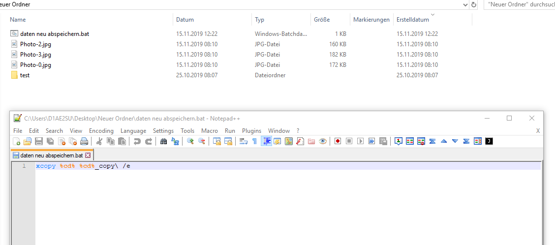 kann mir jemand helfen eine .bat datei zu schreiben, die ALLE Daten die in dem Ordner sind (außer ggf. die .bat selber), in dem auch die .bat liegt einmal kopiert und neu "einfügt/abspeichert". ->Ich brauche für alle Datein ein neues Erstdarsteller<-