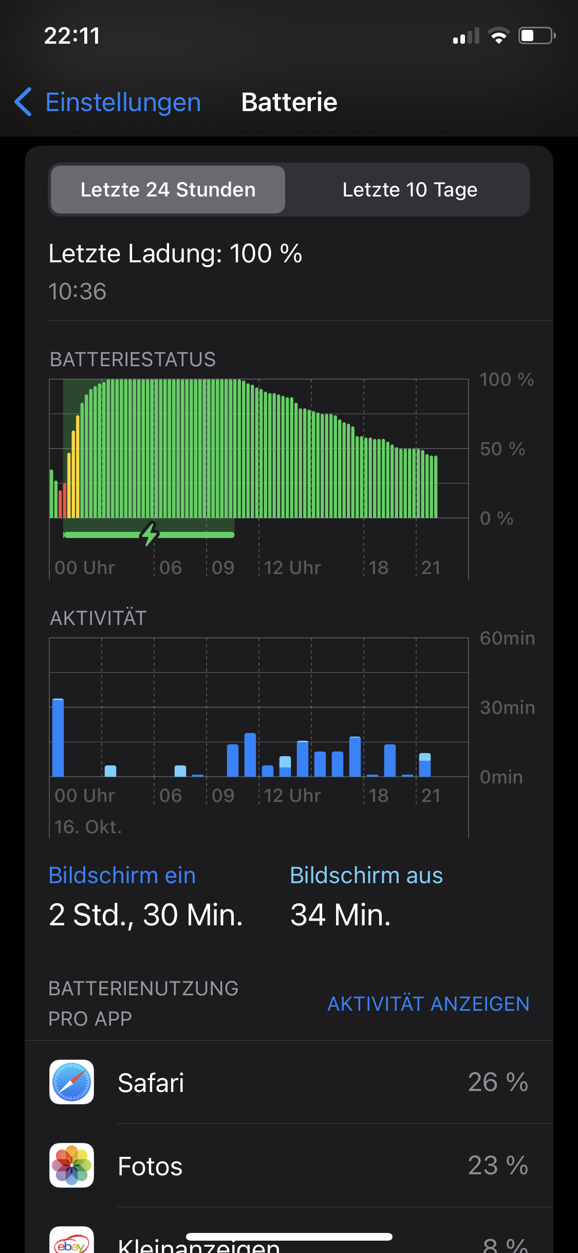 Unter Android konnte ich detailliert sehen, wann ich mein Gerät aufgeladen habe, wie lange die Batterie noch ungefähr halten wird und wie lange ich das Gerät in Nutzung hatte, seit der letzten, vollständigen, Ladung.