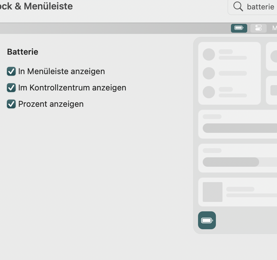 An für sich kann man in den Einstellungen unter "Dock & Menüleiste" bei "Andere Module" die Batterie auswählen und in das Kontrollzentrum oder die Menüleiste einfügen. Allerdings ist diese Option bei mir nicht auszuwählen.
