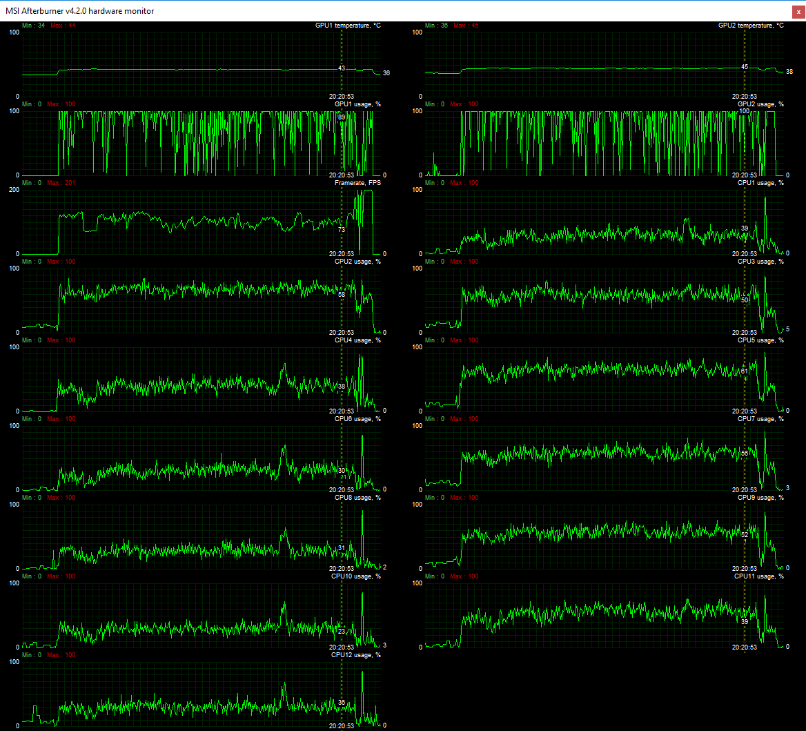 So siehts gerade aus in 1920x1200 auf Ultra in DX11 (ohne Overclocking - weder CPU noch die GPUs). Man sieht auch, dass es nicht den einen Renderthread gibt, d.h. kein CPU-Limit hier: