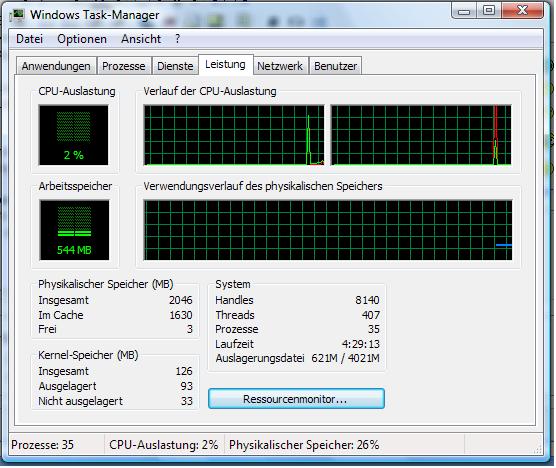 Die Speicherauslastung durch Superfetch wird übrigens nicht als belegt in der Anzeige des Taskmanagers angezeigt. Wieviel für Superfetch verwendet wird, sieht man unter "Cache" in der Box unter dem Graph.