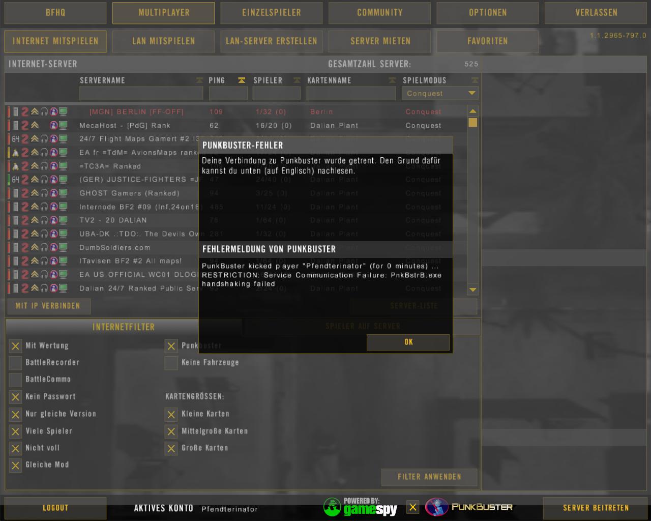 Vielen Dank für Eure Bemühungen, aber ich bin drauf und dran, das Spiel in die Tonne zu hauen. Zunächst glaubte ich, dass ich die Lösung gefunden hätte... dann stürzte das Spiel ab, nachdem ich einen Server verlassen hatte und es tauchte daraufhin bei jedem Server die Meldung auf, dass PunkbusterB keinen Kontakt aufnehmen konnte und ich wurde sofort gekickt (trotz dessen, dass mir punkbustersvc.exe "bescheinigte" dass alles OK sei... hatte es trotzdem nochmals neu installiert). Dann habe ich meine Firewall de- und wieder installiert und auch F***buster... jetzt hängt das verdammte Spiel wieder und der Rechner stürzt sogar ab... it really sucks...