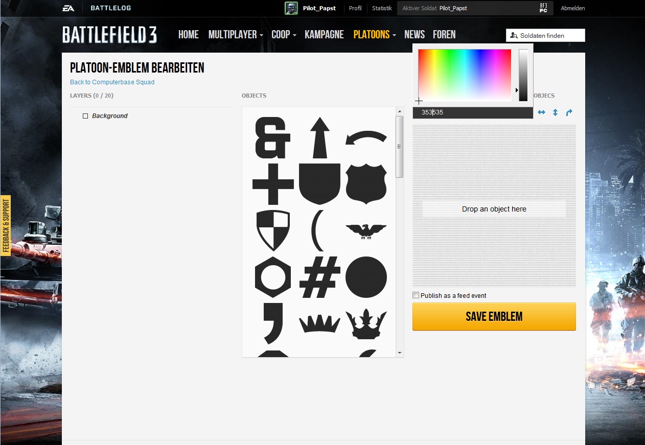 Also ich hab die Frage schonmal im Battlelog Platoon gestellt: Wer erstellt ein Emblem? Dieser Emblem Creator in Battlelog ist zwar nicht das wahre, aber andere Logos werden ja nicht zugelassen oder sehe ich das falsch?
