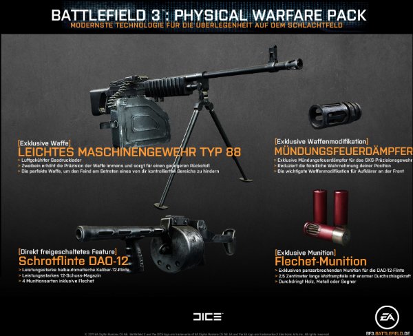 Alle Vorbesteller bis einschließlich 26. Oktober 2011 von Battlefield 3 - Limited Edition erhalten das "Physical Warfare Pack". Es enthält modernste Technologie für die Überlegenheit auf dem Schlachtfeld: