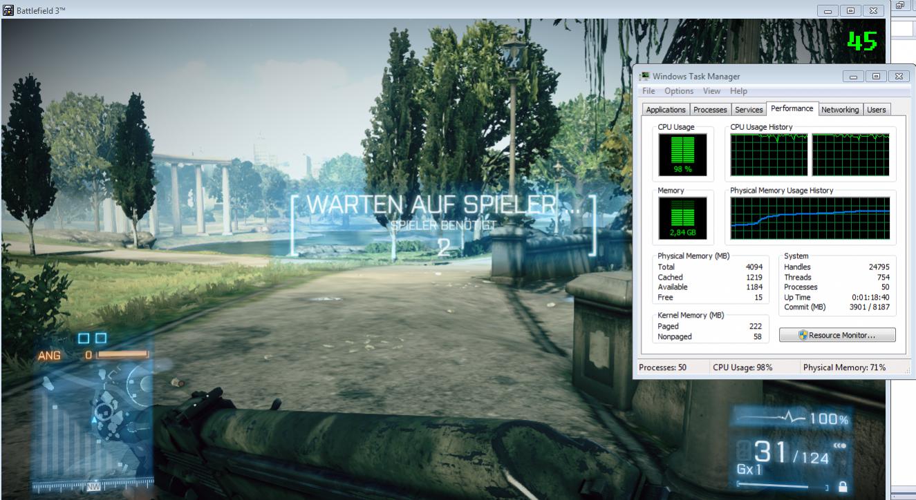 Hab mir vor ein Paar Tagen Battlefield 3 zugelegt. Hab immer fleißig BFBC2 gespielt lief problemlos auf Hight-Ultra (Grafikkarte war Oc'd). Jetz dachte ich ich kann Bf3 auch spielen aber ätsch. Auf der niedrigsten auflösung und mit 60Herz geht trozdem fast nichts. Läuft mit 60 Fps (auch auf Med-Hight) aber manchmal brechen die Fps dann ein alle 10 Sek. und gehen auf 20 oder 26 runter für eine Sekunde. So kann man das spiel nicht spielen ist ziemlich nervig. Treiber habe ich die Neusten (11.11 glaub ich) hab die CPU auch schon mal auf 3Ghz Hochgetaktet hat nichts gebracht. Keine ahung woran das liegt, würde mir aber ungern noch einen quadcore zulegen. Hab 4gb Ram sollte auch passen. Selbst auch Canyourunit bin ich fast bei Recommended und der sagt es läuft 100pro. Bin bisschen enttäuscht.