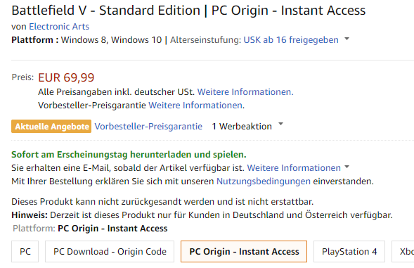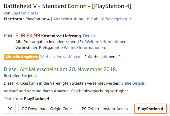 Ich habe mir Battlefield 5 für PS4 auf Amazon vorbestellt um Vorabzugang für die Offene Beta zu erhalten. Jedoch habe ich noch immer keinen Code bekommen. Normalerweiße bekommt man immer direkt einen Code nachdem man bestellt hat. (The Crew 2, Black Ops 4). Nun, hat jemand von euch Battlefield 5 auf Amazon vorbestellt und den Code bekommen? Oder weiß jemand ob vielleicht Amazon nicht in dieser "Werbeaktion" dabei ist? Oder weiß jemand wie man noch den Vorabzugang zur Beta bekommt?