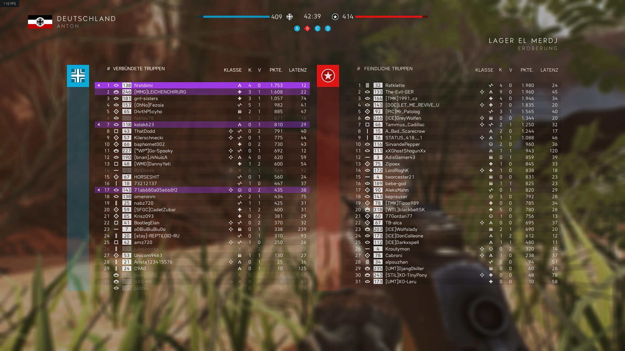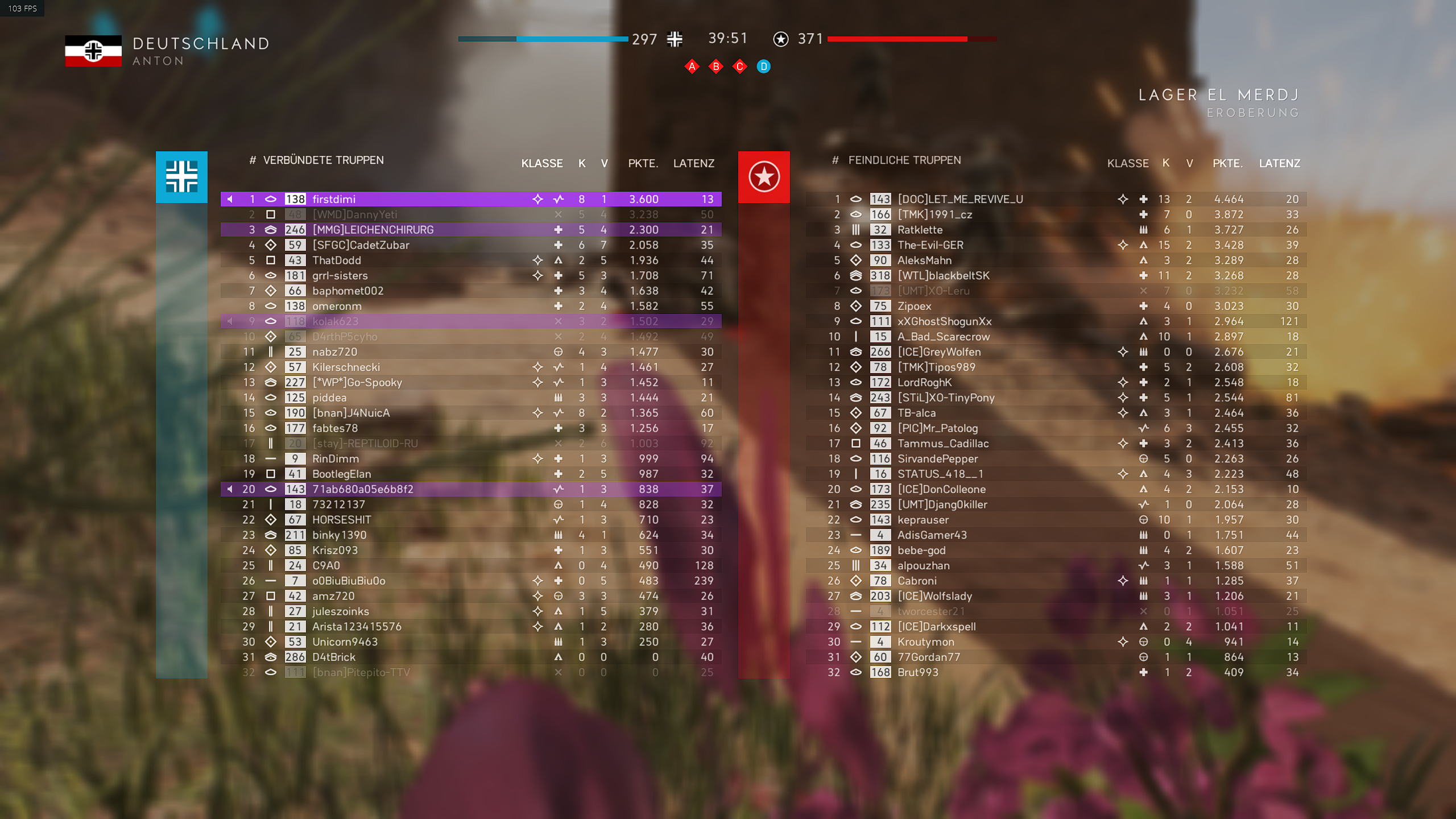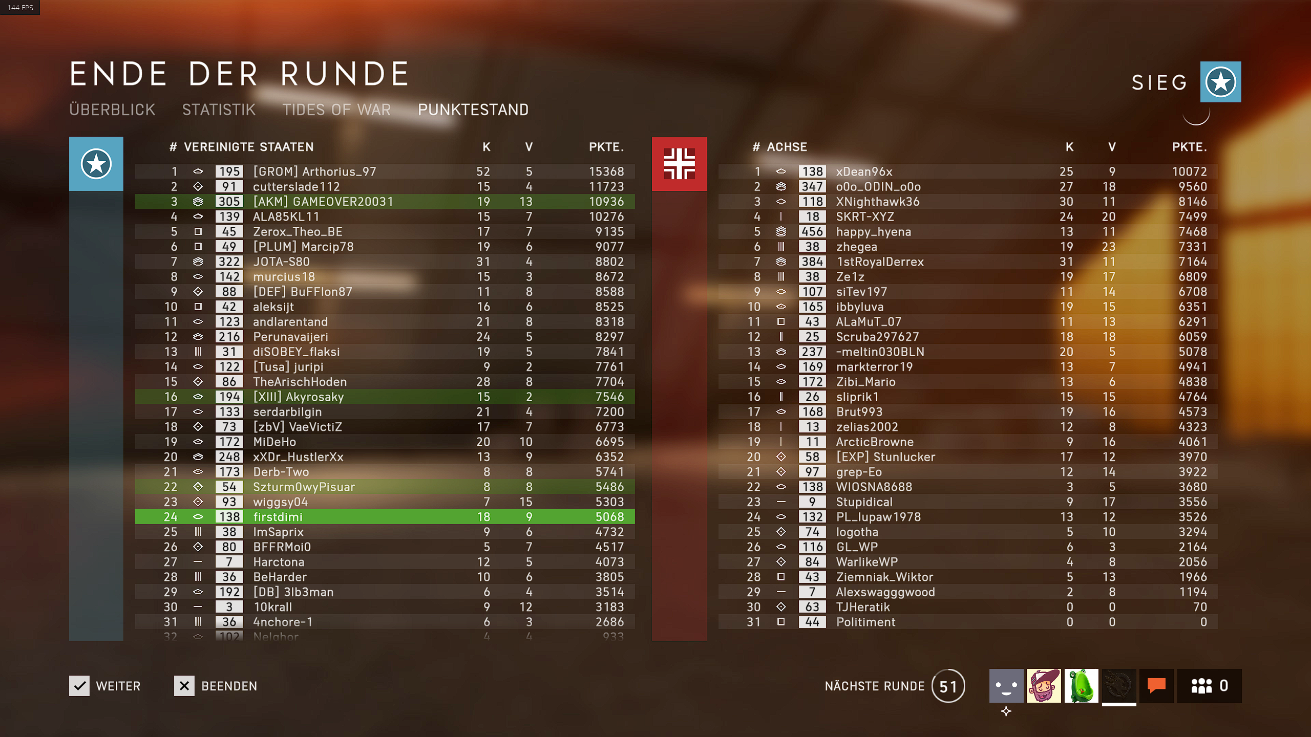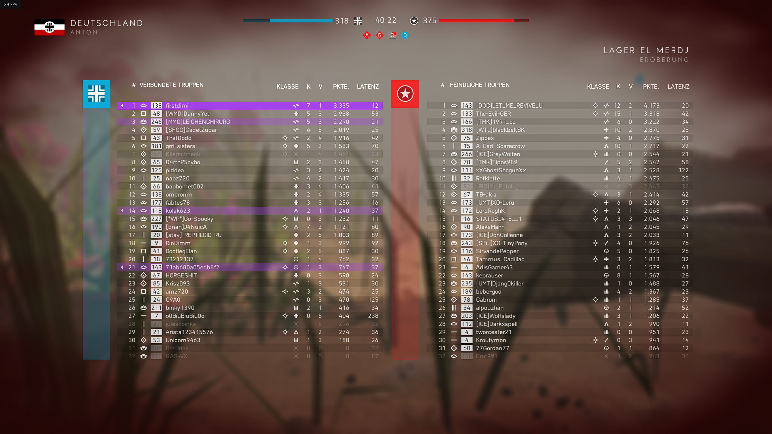 Bin kein hervorragender Spieler, immerhin war ich schon Mal bei mit 64 Spieler voll-gelegten Hauskampf im Lager El Merdj erster.