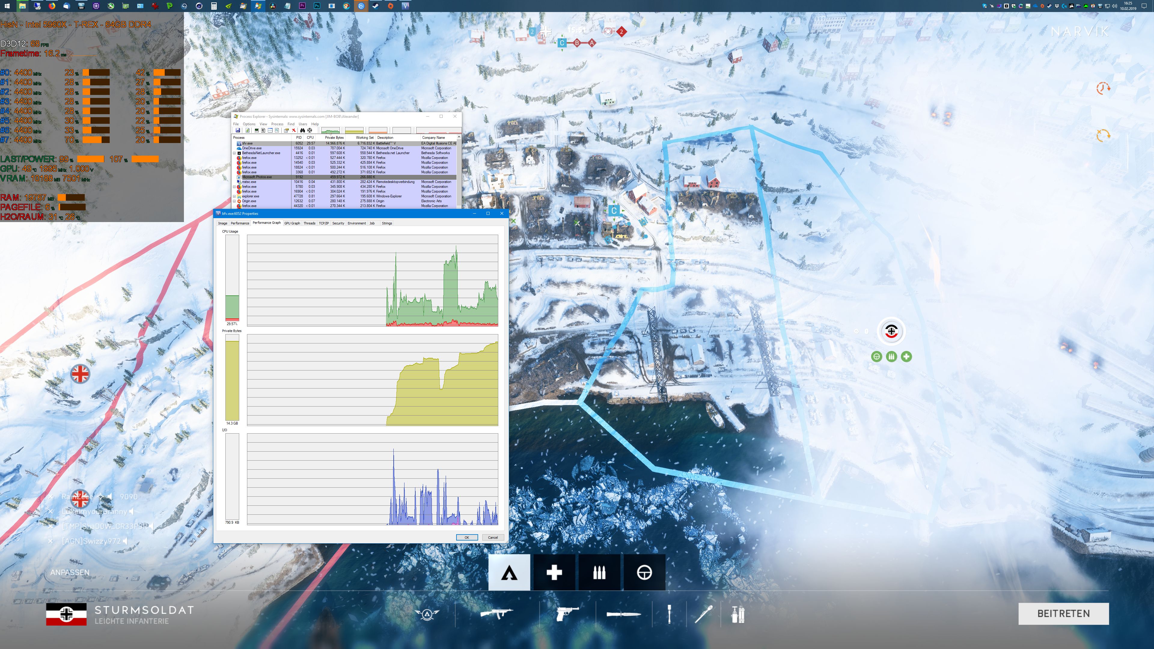 Für die Auswertungen werde ich einfach das Benchtool im Afterburner mitloggen lassen, sowie den Frametimegraph anzeigen. Interessant sind noch etwaige Festplatten-(Swap-)Zugriffe, daher noch der Taskmanager. Bei ersten Tests lief leider noch ein Windows Update im Hintergrund - darauf also achten, wenn die Zugriffe aussagekräftig seien sollen.