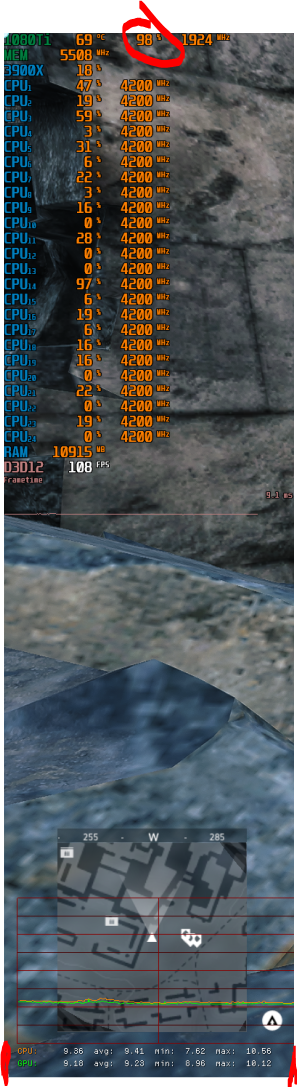 Dann bekommst du die Leistung der CPU und GPU in ms angezeigt. Was du haben willst ist dass beide Linien gleich auf liegen. Wenn die CPU Linie höher als die GPU Linie ist limitiert deine CPU: