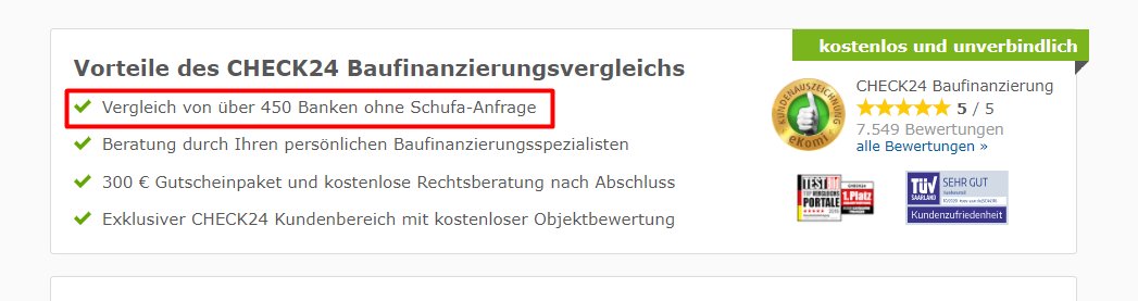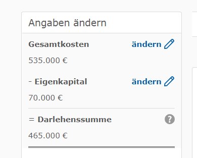 Ich hab jetzt einfach diese sonstigen Nebenkosten für Küche etc. mit 50.000€ kalkuliert was mich zu einer Gesamtsumme (Kauf-Kosten, Kauf-Nebenkosten und sonstige Nebenkosten) von 535.000€ bringt. Das hab ich auch genau so bei Check24 eingetragen in der Vergleichsansicht (Screenshot anbei). Dann hab ich bei Eigenkapital die vollen 70.000€ angesetzt, was mich zu einem Darlehen von 465.000€ bringt - soweit so gut.