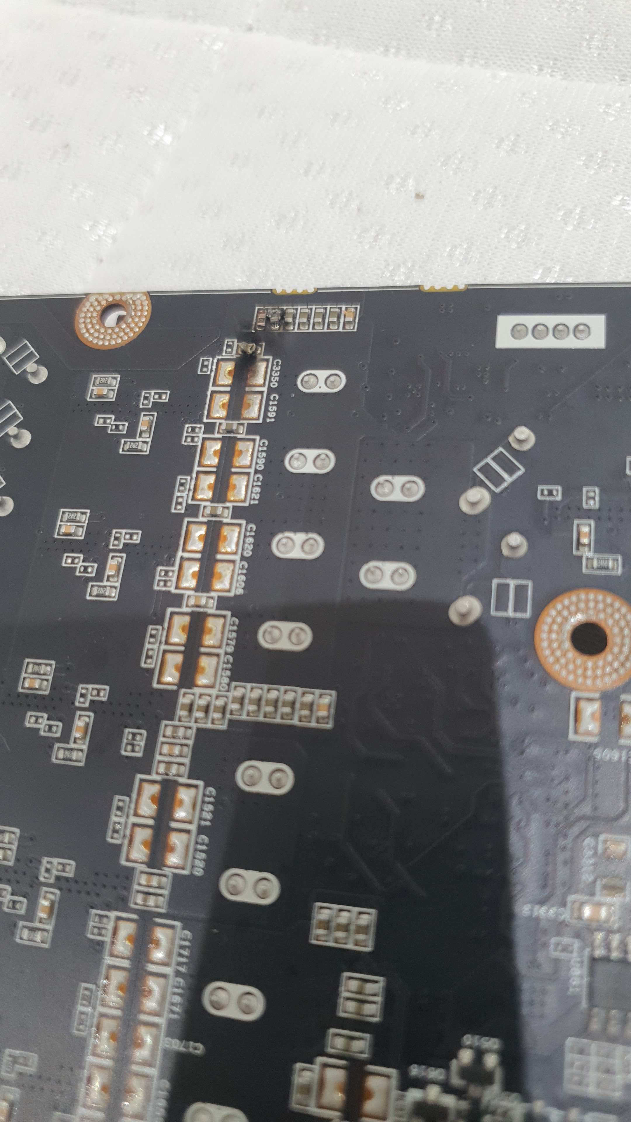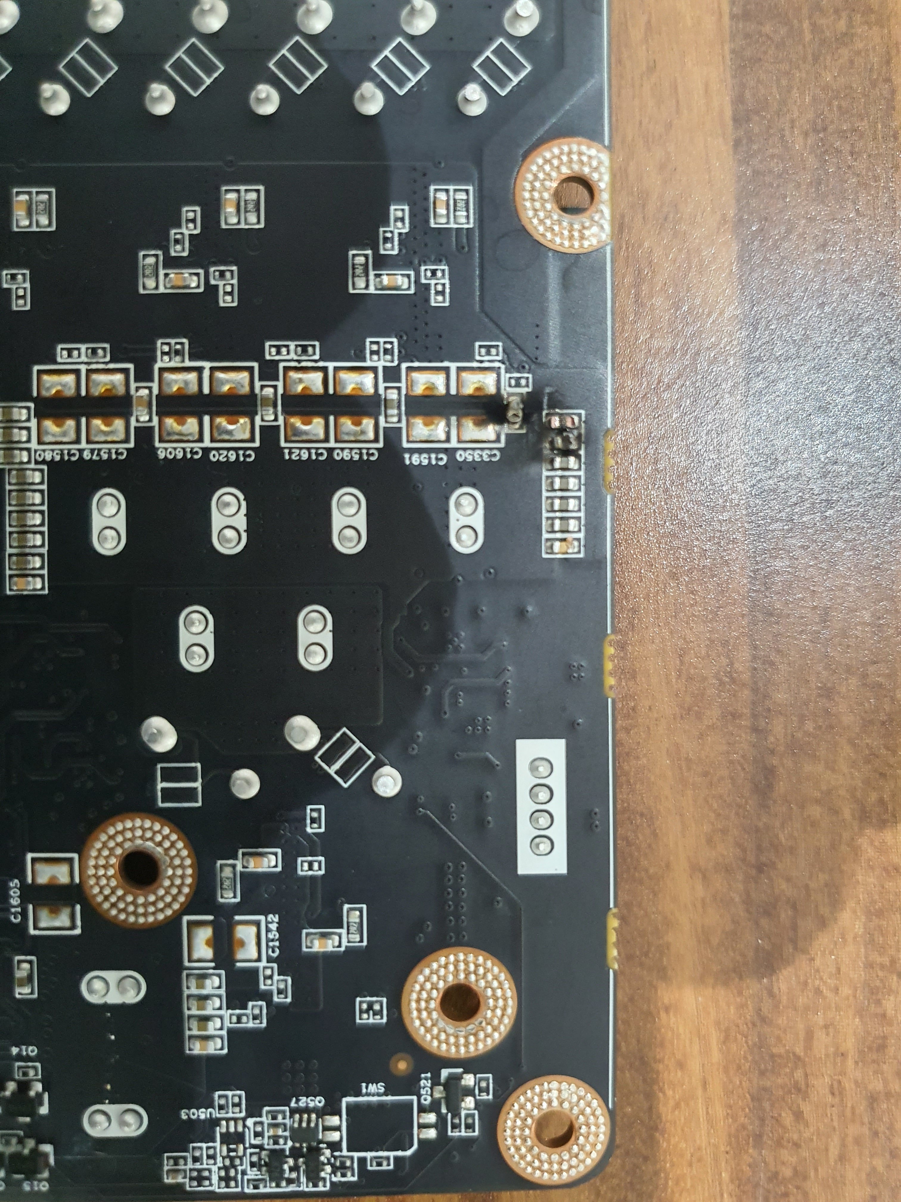 Das sind übrigens MLCCs, also kleine Kondensatoren. Das die drei zufällig durchbrennen halte ich für unwahrscheinlich, ich glaube hier hast du tatsächlich ein Problem in der Spannungsgenerierung. Die sehen aus als wären sie aufgrund zu hoher Spannung durchgebrannt, was nichts gutes für den Rest der GPU bedeutet.