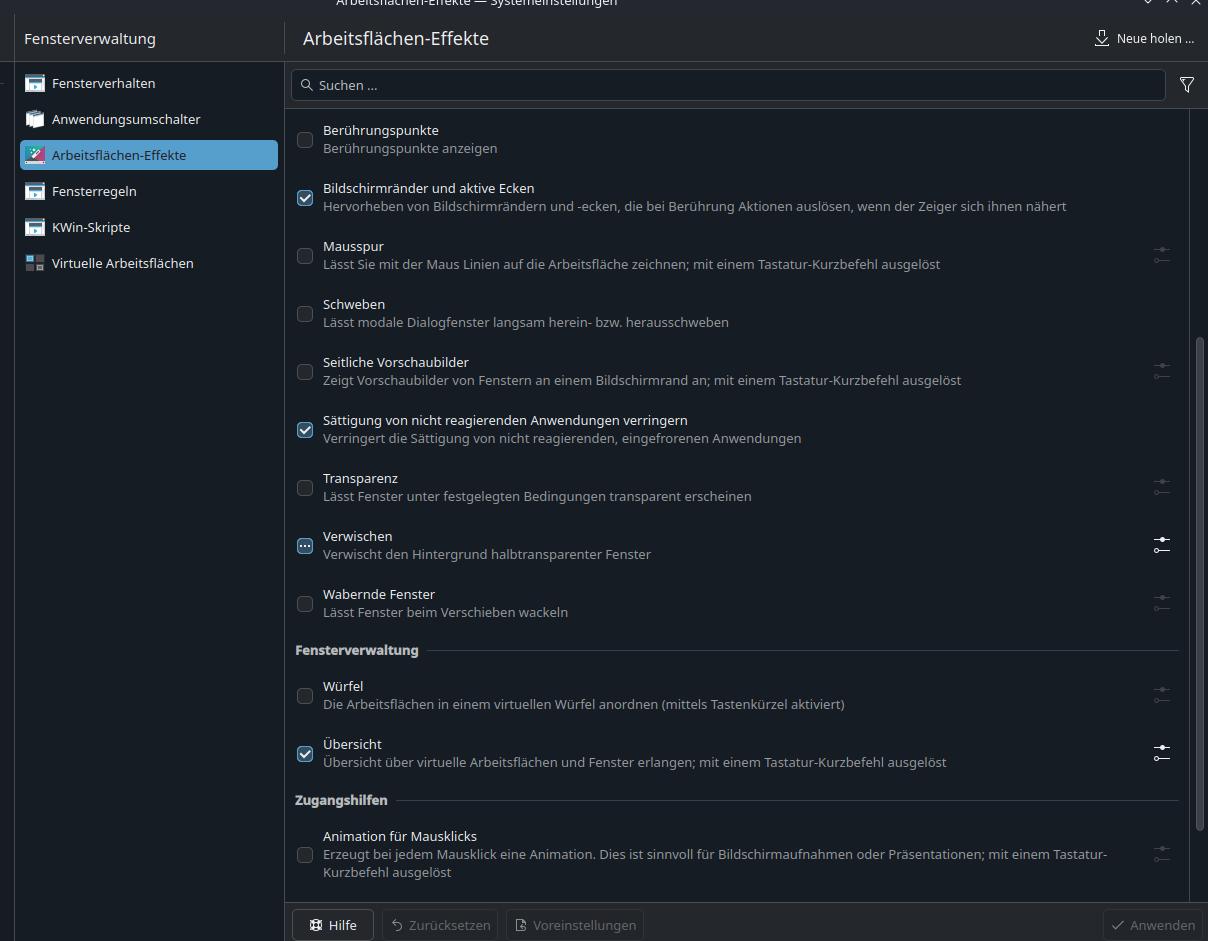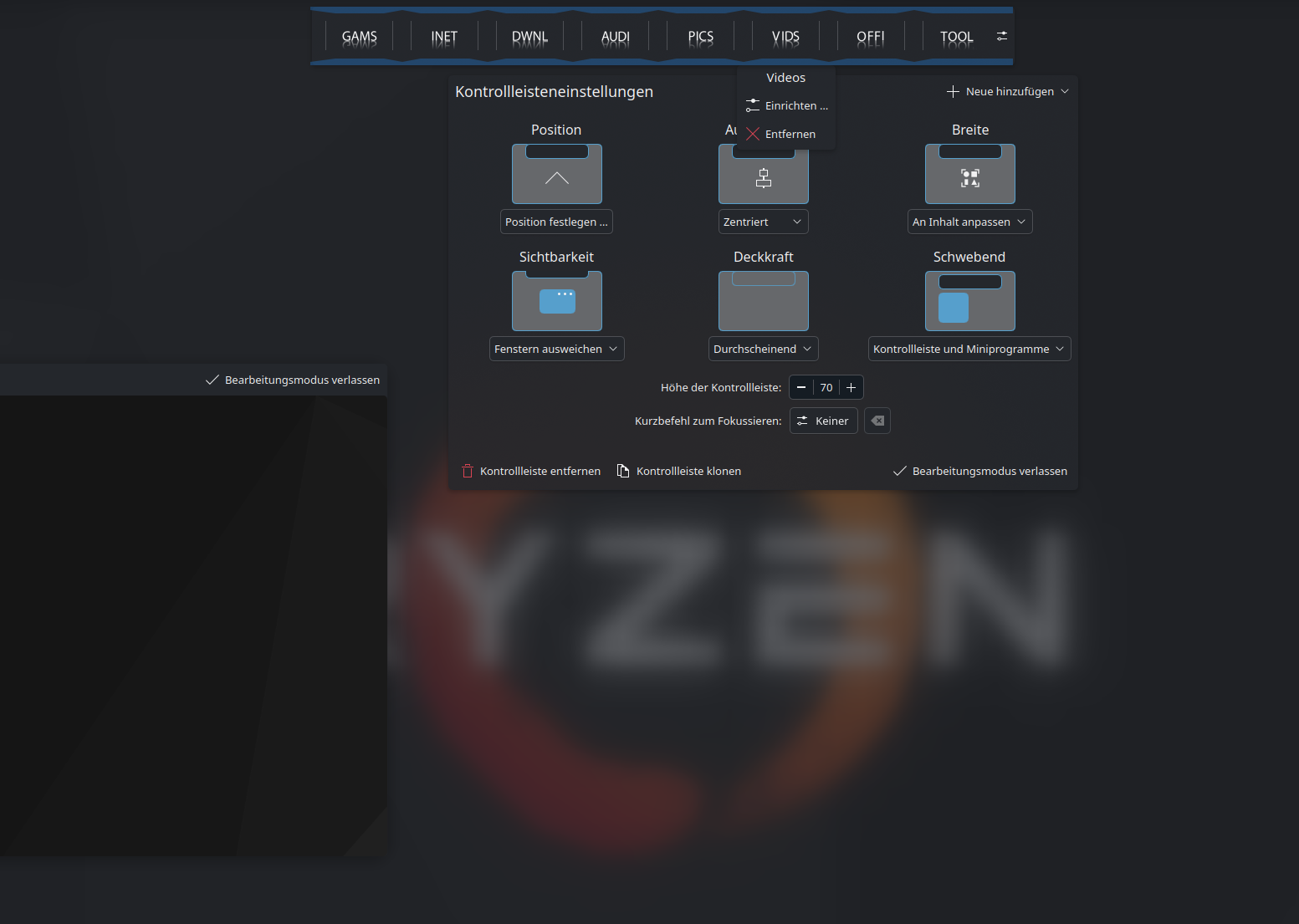 ich habe mir ein kleines Panel/Dock (ohne irgendwelche 3rd Party Plugins) gebastelt in Bazzite (Desktop/KDE) um ein paar Schnellzugriffe auf Ordner zu haben. Ich habe bei Deckkraft Durchscheinend eingestellt, aber das Panel hat nach wie vor einen grauen Hintergrund.