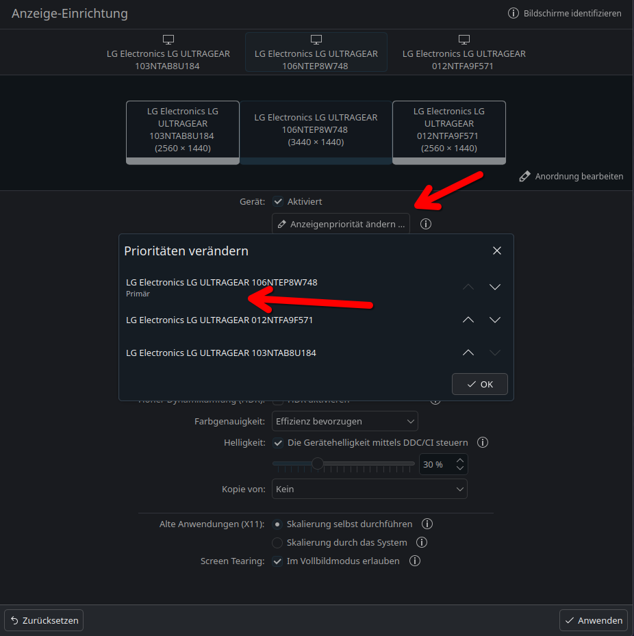 wie sage ich Bazzite, das mein mittlerer von 3 Monitoren das Primäre Display sein soll? Bisher startet der alle Games immer auf dem rechten Monitor. Hab die Desktop Version installiert.