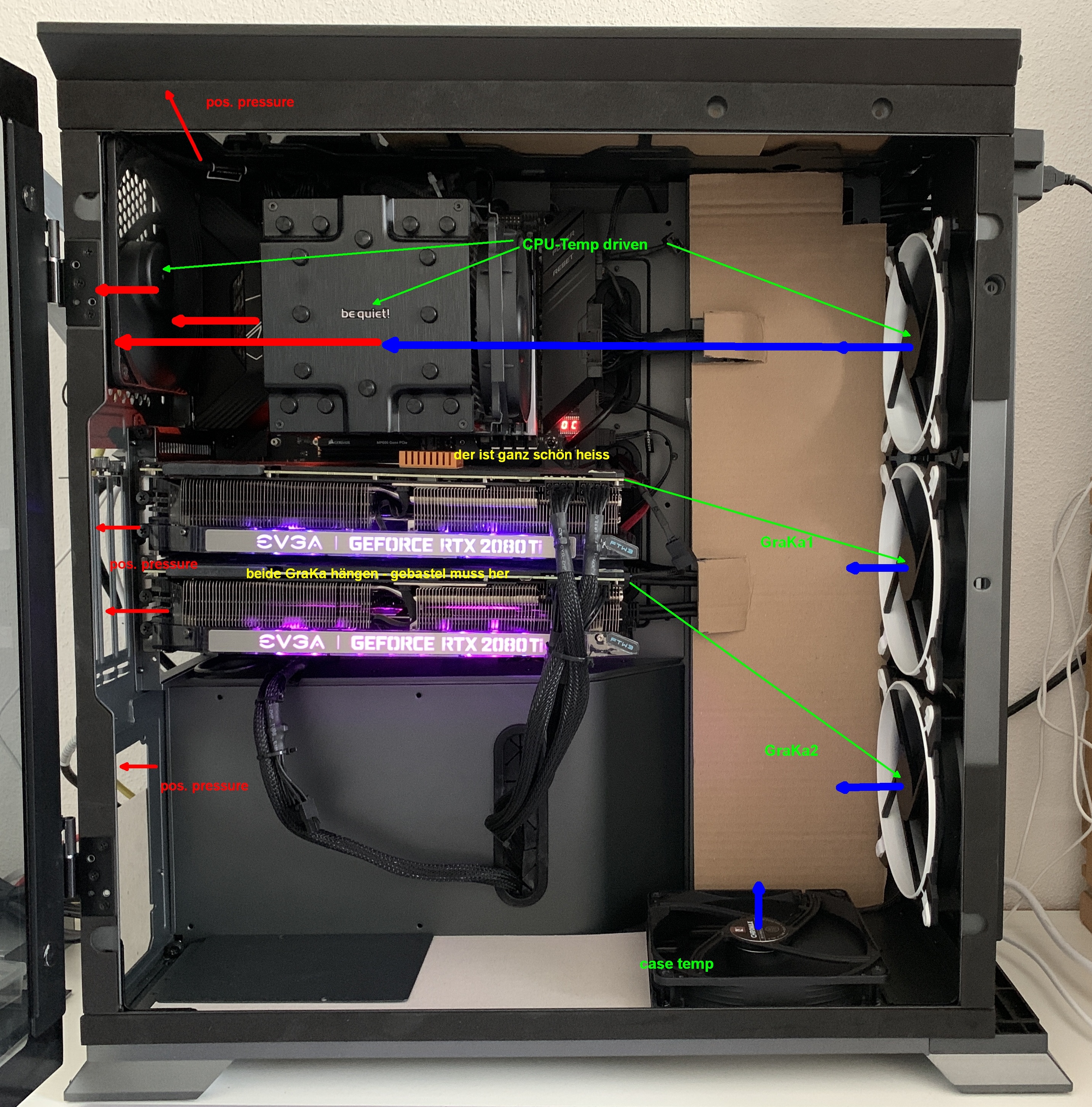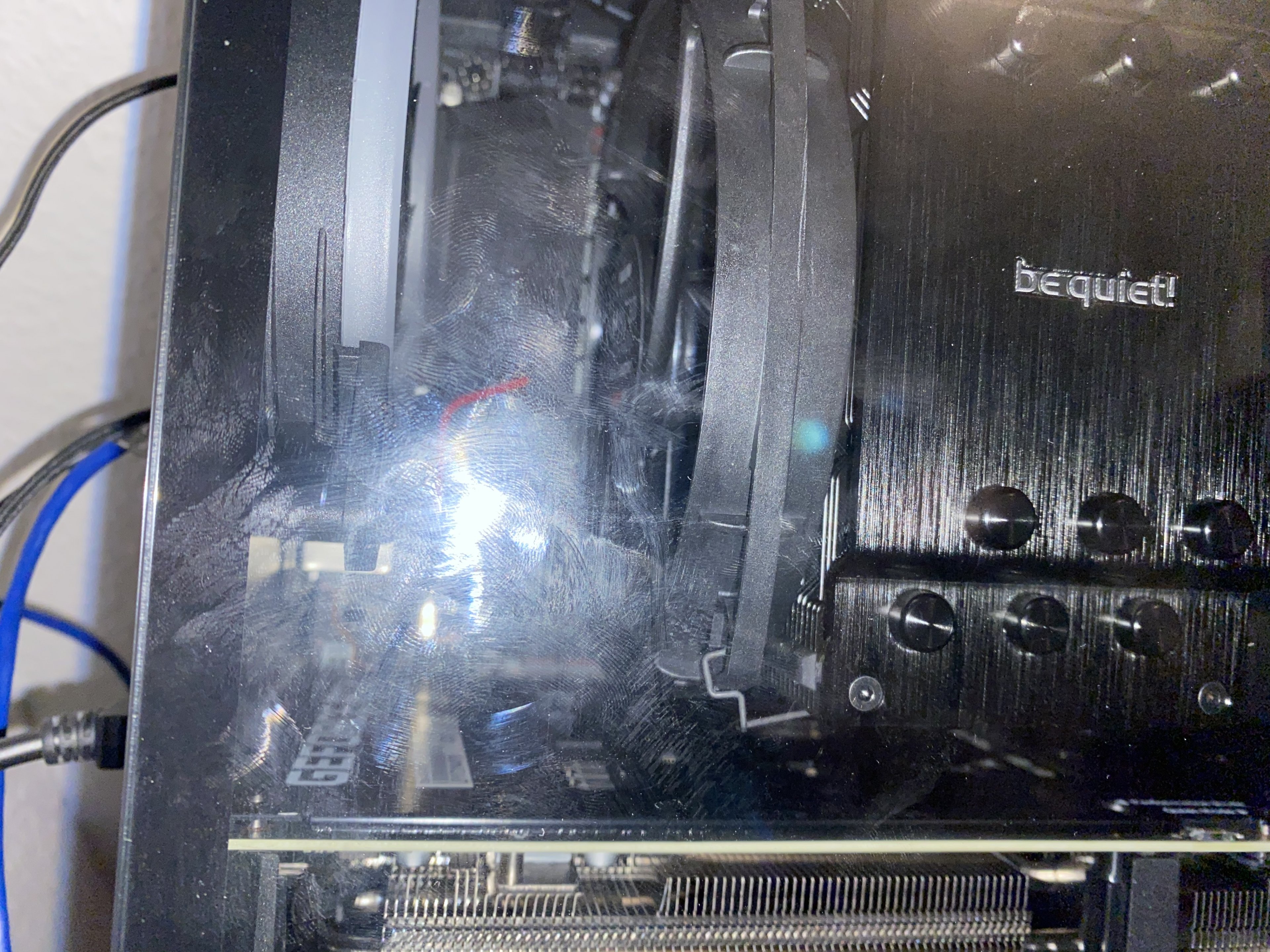 ich habe mir einen Be quiet dark rock 4 auf einen ryzen 7 3800xt bauen lassen. Das Gehäuse ist ein Sharkoon tg4 ( 3x 120mm vorne rein, 1x 120mm hinten raus, sind auch richtig eingestellt). Der Lüfter ist richtig eingebaut worden, jedoch finde ich es komisch, wie der Lüfter des dark rock montiert ist und der ist nämlich Links montiert. Es scheint so, dass er die Wärme aus den Finnen herauszieht und nicht die kalte Luft von der Ram Seite durch den Lüfter zieht. Also das er wie der hintere Lüfter die Luft aus dem gehäuse/ der Cpu saugt. Unter volllast bei cpu z 15 min macht er max. 82 grad, aber bei spielen (z. B. Apex), kommen auch mal ganz kurz Spitzen von 93 grad, diese sind ca 1-2s da. Generell ist der Kühler jedoch sehr leise ( trotz 1400rpm)