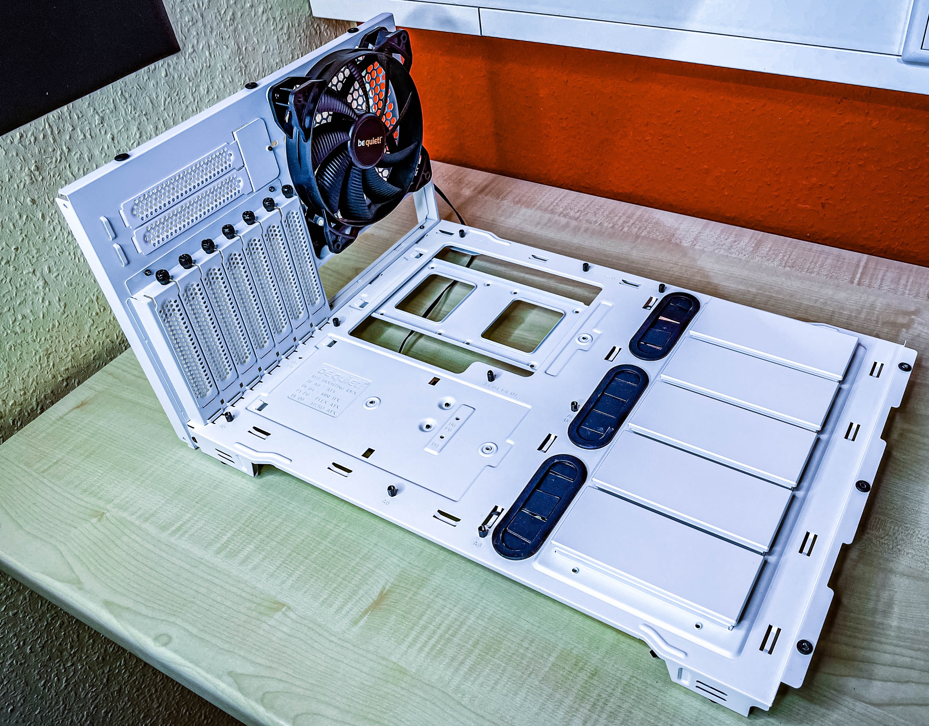 Be quiet! stellt euch bei der Silent Base 802 ingesamt 7+2 PCIe Steckplätze zur Verfügung, denn ihr könnt die Grafikkarte mit einem Riser-Kabel auch vertikal verbauen. Pfiffig ist eine Aussparung im Mainboard-Tray, um ein Kabel aus dem Inneren nach Außen zu führen – oder umgekehrt. Zwischen Glas und Gehäuse klafft eine kleine, Konstruktionsbedingte Lücke, die der Möglichkeit geschuldet ist, das Gehäuse zu invertieren. Dennoch sollte diese Lücke nicht dazu führen, die Geräuschkulisse arg zu verändern oder mehr Staub in das Case eindringen zu lassen.