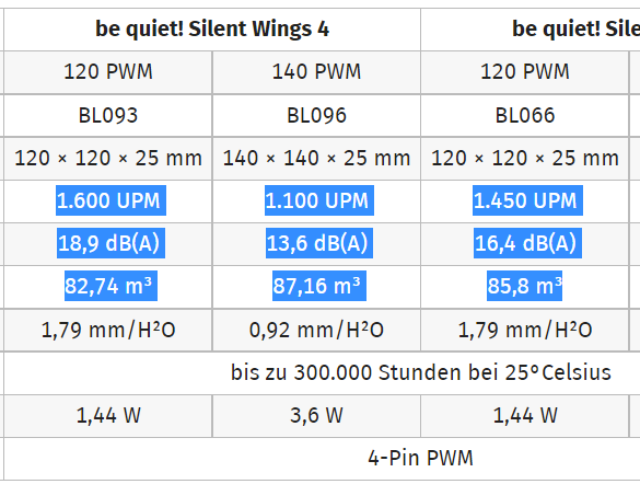 Silent Wings 4 haben also ne höhere Drehzahl, höhere Lautstärke und trotzdem weniger Luftdurchsatz? Warum genau sollte ich die kaufen? Oder sind hier die Daten vertauscht?