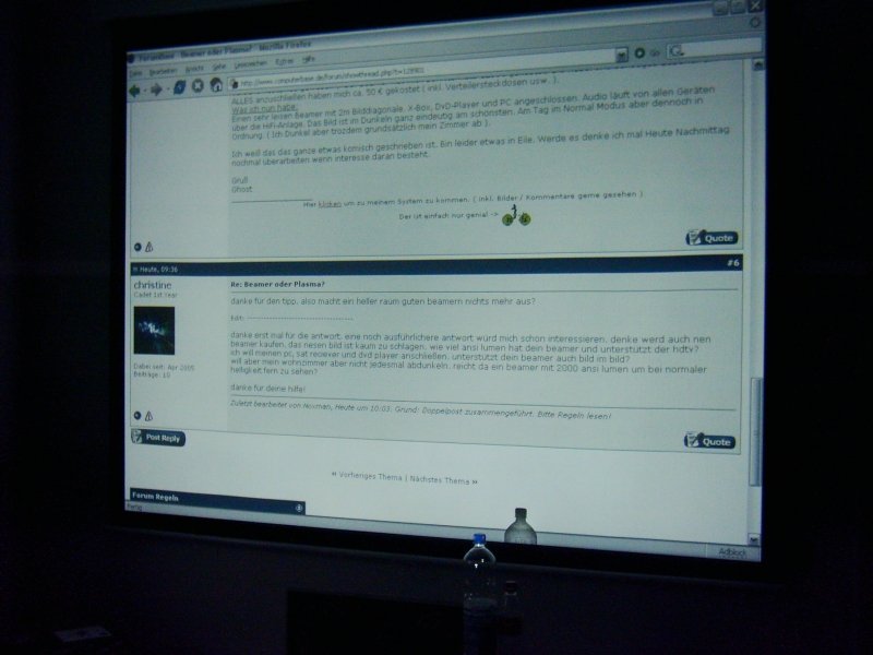 Einen sehr leisen Beamer mit 2m Bilddiagonale. X-Box, DvD-Player und PC angeschlossen. Audio läuft von allen Geräten über die HiFi-Anlage. Das Bild ist im Dunkeln ganz eindeutig am schönsten. Am Tag im Normal Modus aber dennoch in Ordnung. ( Ich Dunkel aber trozdem grundsätzlich mein Zimmer ab ).