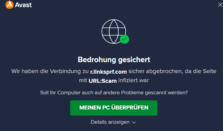 seit einigen Tagen bekomme ich durch Avast die Meldung, dass r.linksprf.com eine Bedrohung darstellt. Ich habe mein Antiviren Programm schon etliche Male durchlaufen lassen, doch leider kommt die Meldung immer wieder. Auch bei Microsoft Edge und Firefox kommt diese Meldung.
