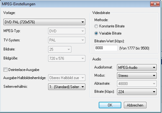 Video + Ton dürfen bis zu 6 MBit/s haben, dann passen 180 Minuten an Video auf eine DL DVD.
