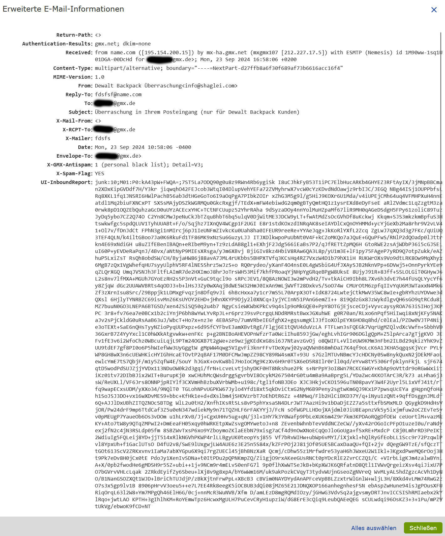 die Mails werden korrekt von GMX als Spam erkannt und in den entsprechenden Ordner verschoben.