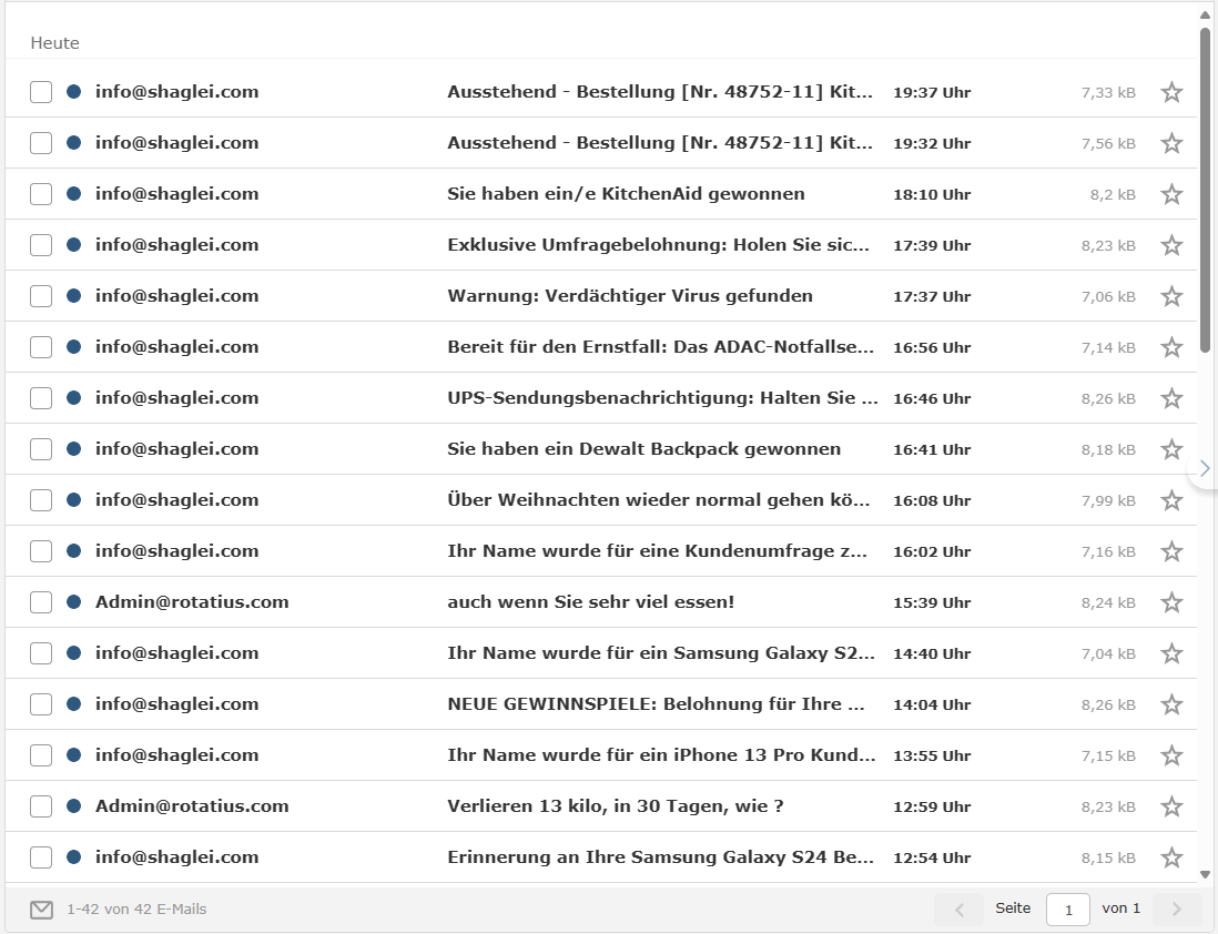 Hallo, ich bekomme täglich an die 80 Spams von info@shaglei.com, gibt es eine Möglichkeit die irgendwie zu blockieren? So daß die gar nicht erst im Spam-Ordner landen meine ich. Denn mein Spam-Ordner platzt aus allen Nähten und ich muß mich jedesmal durch tausende shaglei-Mails wühlen um versehentlich gelandete Mails dort zu sichten.