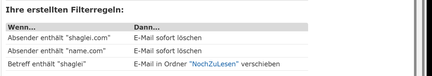 info@shaglei.com" ist, dann bringt Dir die Sperrliste gar nichts. GMX (Freemail) filtert nur nach den E-Mail-Adressen oder Domains. Ich glaube mal irgendwo gelesen zu haben, dass GMX-Promail die Filterung anhand des E-Mail-Inhalts evtl. sogar anhand des Namens zulässt. Kannst ja mal ein paar Beispiele für die tatsächlichen E-Mail-Adressen hier reinschreiben.