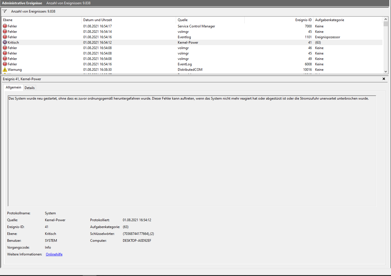 "Das System wurde neu gestartet, ohne dass es zuvor ordnungsgemäß heruntergefahren wurde. Dieser Fehler kann auftreten, wenn das System nicht mehr reagiert hat oder abgestürzt ist oder die Stromzufuhr unerwartet unterbrochen wurde." (mit der Quelle: Kernel-Power)