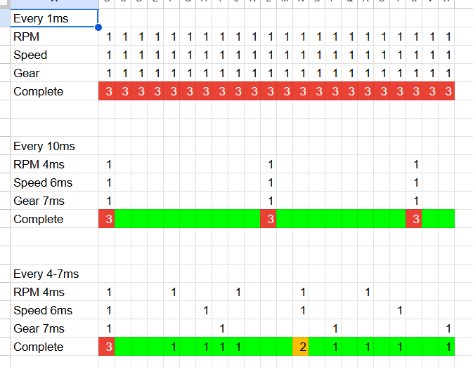 Das bedeutet, Worte oder Sätze wie "Fuel Remaing Laps" wurden gar 1000 mal / Sek. aktualisiert, obwohl diese sich nie ändern. Es entsteht konstruktiven Interferenz. Also habe ich jetzt für alles, was man mit Timings belegen kann, mit so niedrig wie möglichen, aber so hoch wie nötigen Werten belegt und ausschließlich Premzahlen verwendet. Denn auch eine Uhrzeit, welche keine Sekunden darstellt, kann Timings oberhalb der 60.000ms nutzen, ohne dass es groß auffällt.